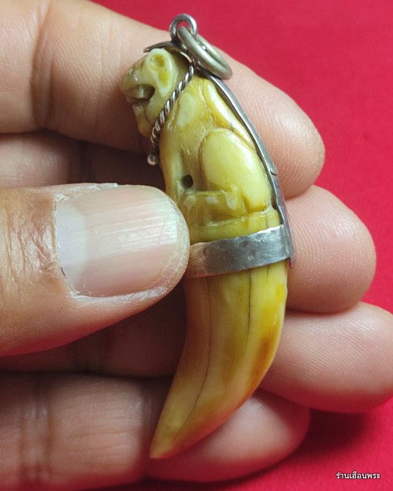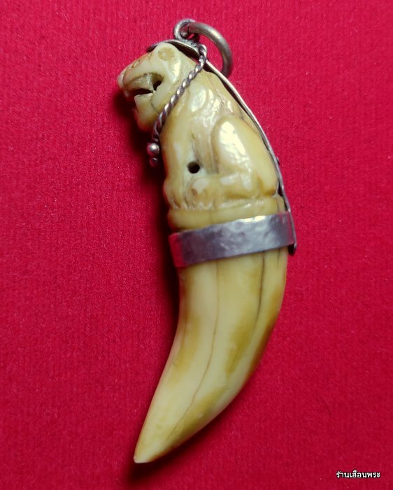 | เขี้ยวเสือเต็มเขี้ยวพิมพ์อ้าปาก หลวงพ่อปาน วัดบางเหี้ย จ.สมุทรปราการ เขี้ยวเสือถือเป็นเครื่องรางของขลังที่นิยมมาตั้งแต่สมัยโบราณ เสือ เป็นสัตว์ปราดเปรียวฉลาด ว่องไว เฉียบขาด มีตบะแก่กล้าและอำนาจ สามารถที่จะใช้ตาสะกดสัตว์อื่นๆให้อยู่ในอำนาจได้ หลวงพ่อปานท่านได้นำเขี้ยวเสือมาแกะเป็นเครื่องรางของขลัง ลงคาถาอาคม ปลุกเสกอย่างเข้มขลัง ผู้คน ลูกศิษย์ และชาวบ้านในละแวกนั้นได้นำไปบูชาติดตัว ต่างก็มีประสบการณ์ที่ดี จึงเป็นที่นิยมเสาะแสวงหามาบูชาติดตัวกันตั้งแต่นั้นมา สำหรับเขี้ยวเสือตัวนี้แกะได้สวยงามมาก ศิลป์นิยม จารครบสูตร แกะมาจากเขี้ยวเสือแท้ๆ ครับท่าน ดูง่ายๆ เขี้ยวผิวเก่าๆ แห้งๆ เป็นธรรมชาติ สวยสมบูรณ์ ไม่มีบิ่นหักชำรุด และซ่อมใดๆ มาพร้อมเลี่ยมกระเช้าเงินแบบโบราณแขวนบูชาติดตัวครับท่าน |