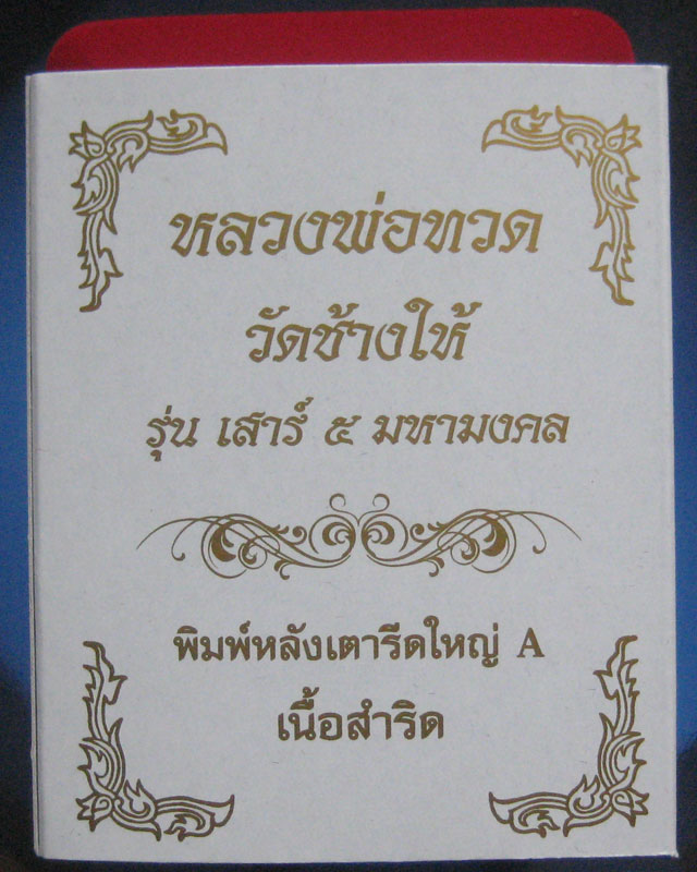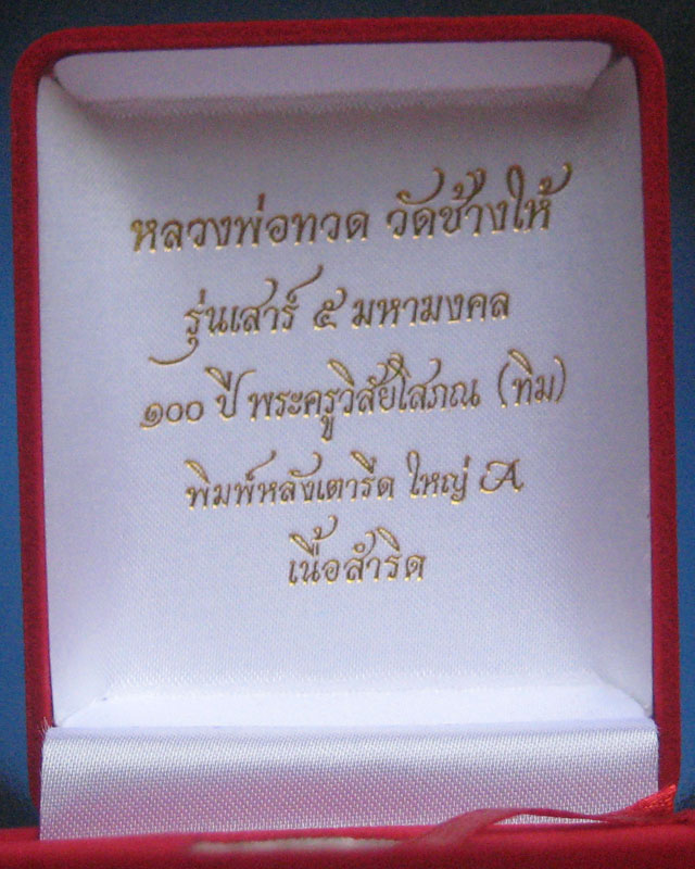 | 100 ปี ชาตกาล (พ.ศ.2455-2555) ของพระอาจารย์ทิม หรือพระครูวิสัยโสภณ อดีตเจ้าอาวาสวัดช้างให้ ปฐมเหตุแห่งตำนานการสร้างพระเครื่องหลวงพ่อทวดที่โด่งดัง ต่อมาท่านเจ้าคุณพระสุนทรปริยัติ วิธาน เจ้าอาวาสวัดช้างให้ รูปปัจจุบัน ได้แสดงออกซึ่งความกตัญญูกตเวทิตาคุณ น้อมรำลึกบารมีธรรมหลวงพ่อทวดและพระอาจารย์ทิม ครบรอบ 100 ปี ชาตกาล จึงได้จัดสร้างวัตถุมงคล "พระหลวงพ่อทวด รุ่นเสาร์ ๕ มหามงคล" มีพิธีมหาพุทธาภิเษก วันเสาร์ที่ 20 ตุลาคม พ.ศ.2555 ณ.อุโบสถวัดช้างให้ เวลา 15.55 น. วัตถุประสงค์ในการจัดสร้าง หลวงพ่อทวด รุ่นเสาร์ ๕ มหามงคล 1.เพื่อน้อมรำลึกคุณูปการของอาจารย์ทิม 2.จัดซื้อที่ดินขยายอาณาเขต วัดช้างให้ 3.บูรณปฏิสังขรณ์ซุ้มประตูรอบพระอุโบสถ วัดช้างให้ 4.สนับสนุนการศึกษาพระปริยัติธรรมแผนกนักธรรม แผนกบาลี ประจำจังหวัดปัตตานี 5.ส่งเสริมศูนย์การศึกษาพุทธศาสนาวันอาทิตย์ วัดช้างให้ 6.งานสาธารณประโยชน์ของทางราชการ และประชาชนทั่วไป รายการวัตถุมงคล หลวงพ่อทวด รุ่นเสาร์ ๕ มหามงคล ครบรอบ ๑๐๐ ปี พระอาจารย์ทิม พระบูชา 1.หลวงพ่อทวด 15 นิ้ว เนื้อนวโลหะ ฐานสี่เหลี่ยม (ไม่มีบัว) ตามจอง 2.หลวงพ่อทวด 12 นิ้ว ฐานบัวรมดำ 2,555 3.หลวงพ่อทวด 9 นิ้ว ฐานบัวรมดำ 5,555 4.หลวงพ่อทวด 5 นิ้ว ฐานบัวรมดำ 5,555 หลังเตารีดพิมพ์ใหญ่ A (หล่อโบราณ) 1.พระช่อ 9 องค์ 255 2.เนื้อนวโลหะ 2,555 3.เนื้อสำริด 5,555 หลังเตารีดพิมพ์ใหญ่ B (หล่อโบราณ) 1.เนื้อนวโลหะ 2,555 2.เนื้อสำริด 5,555 หลังเตารีดพิมพ์กลาง A (หล่อโบราณ) 1.เนื้อนวโลหะ 2,555 2.เนื้อสำริด 5,555 หลังเตารีดพิมพ์กลาง B (หล่อโบราณ) 1.เนื้อนวโลหะ 2,555 2.เนื้อสำริด 5,555 หลังเตารีดพิมพ์เล็ก (หล่อโบราณ) 1.เนื้อนวโลหะ 2,555 2.เนื้อสำริด 5,555 เหรียญเสมา 1.เนื้อทองคำลงยา (แดง) 255 2.เนื้อทองคำ 555 3.เนื้อเงินหน้ากากทอง 1,555 4.เนื้อเงินลงยา (แดง เขียว น้ำเงิน) 2,555 5.เนื้อเงิน 5,555 6.เนื้อนวโลหะ หน้ากากเงิน 2,555 7.เนื้อนวโลหะ 9,555 8.เนื้ออาปาก้า 25,555 9.เนื้อทองแดง 95,555 วัตถุมงคลทุกองค์มีโค้ดและหมายเลขกำกับ (เหรียญเสมา เนื้ออาปาก้า,เนื้อทองแดง มีเฉพาะโค้ด ท) หมายเหตุ : นอกจากรายการดังกล่าวยังมีในส่วนชุดกรรมการได้แก่ 1.เหรียญเสมาเนื้อทองแดงลงยา ชุดกรรมการเล็ก3เหรียญ มี3สี (แดง เขียว น้ำเงิน)จำนวนสร้าง 999 ชุด 2.พระหลวงพ่อทวดหลังเตารีดใหญ่A เนื้อนวะ พิมพ์กรรมการ จำนวนสร้าง 500 องค์ 3.เหรียญเสมาเนื้อเงิน (โค๊ต ก) กรรมการ 4.เหรียญเสมาเนื้อนวโลหะหน้ากากเงิน (โค๊ต ก) กรรมการ |