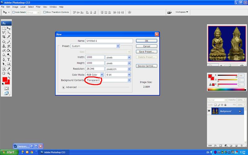 แล้วปิดหน้าใหม่ขึ้นมา ไปที่ File => new ก็จะมีหน้าต่างขึ้นมา กำหนดความกว้าง สูง หรือทำตามตัวอย่างก็ได้ครับ