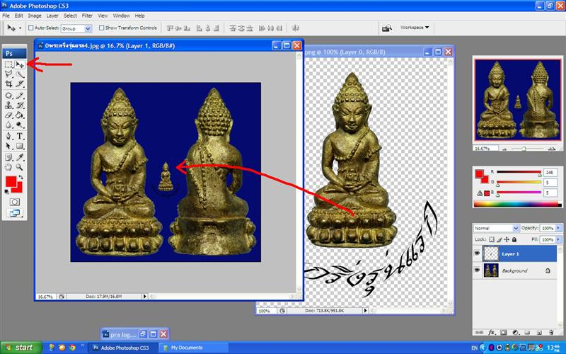 แล้วเลือกที่เครื่องมือ Move Tool แล้วไปคลิกค้างไว้ที่รูปภาพที่เราตัด แล้วลากมายังหน้าใหม่ที่เราเปิดไว้แล้วก็จะได้ออกมาตามรูป