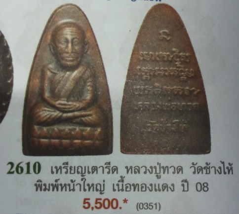 | รายละเอียด | หลวงปู่ทวด วัดช้างให้ พิมพ์เตารีดหลังหนังสือ พิมพ์ใหญ่ ปี ๒๕๐๘ เนื้อทองแดง เนื้อจัด ผิวแห้งเก่าได้อายุ หายากแล้ว ไม่ควรพลาด เบาๆ น่าบูชา สนใจหรือชอบเชิญบูชาครับ ยังมีอีกหลายรายการลองชมดูครับ ราคาเบาวัดใจทั้งนั้นครับ การขอบารมีอันศักดิ์สิทธิ์ของหลวงปู่ทวด : ด้วยการจุดธูป 16 ดอก บูชาวัตถุมงคลของท่านรุ่นใดก็ได้ หรือ ระลึกถึงท่าน ตั้งจิตให้เป็นสมาธิแน่วแน่และศรัทธา ท่อง " นะโม โพธิสัตโต อาคันติมายะ อิติภะคะวา " 16 จบ เท่านี้ท่านก็รับรู้แล้ว ขออาราธนา บารมีแห่งองค์พระโพธิสัตว์หลวงปู่ทวด โปรดอภิบาล รักษา คุ้มครอง ช่วยเหลือ ดลใจให้ทุกท่านที่ประพฤติอยู่ในศีลธรรม มีความเคารพในชาติ ศาสนา พระมหากษัตริย์ จงมีแต่ความเจริญรุ่งเรือง ตลอดกาลนานเทอญ..... หลวงพ่อทวดเป็นพระอริยสงฆ์ที่ศักดิ์สิทธิ์มาก ผู้ใดได้กราบไหว้บูชา หรือมีพระเครื่องของท่านไว้ติดตัว จะเป็นผู้ที่ประสบแต่ความสุข เป็นที่รักนับถือของคนทั่วไป และสิ่งสำคัญที่สุดคือ ความแคล้วคลาดปลอดภัยจากภยันตรายต่างๆ เพราะจากประสบการณ์ที่ผ่านมา เป็นที่ยอมรับกันโดยทั่วไปแล้วว่า ผู้ที่มีพระหลวงพ่อทวดบูชาติดตัว จะไม่ได้รับอันตรายใดๆ จากอุบัติเหตุการเดินทางเลย ลองชมรายการอื่น ๆ เพิ่มเติมอีกนะครับ แล้วค่อยโอนทีเดียวก็ได้ครับ วัดใจเคาะเดียวแดงทุกรายการ http://www.web-pra.com/AuctionReport/Items?username=MOMON โอนเงินแล้วรบกวนโทรแจ้งหรือ Mail My Box เพื่อการจัดส่งที่รวดเร็ว หรือแจ้งเปลี่ยนแปลงที่อยู่ในการจัดส่งด้วยครับ ขอบคุณมากครับ |