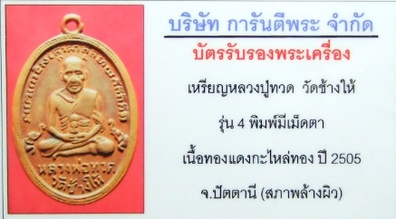 เหรียญหลวงปู่ทวด วัดช้างให้ รุ่นสี่ บล็อคนิยม เนื้อทองแดง กาไหล่ทอง กรรมการ + เลี่ยมทอง + บัตร - webpra