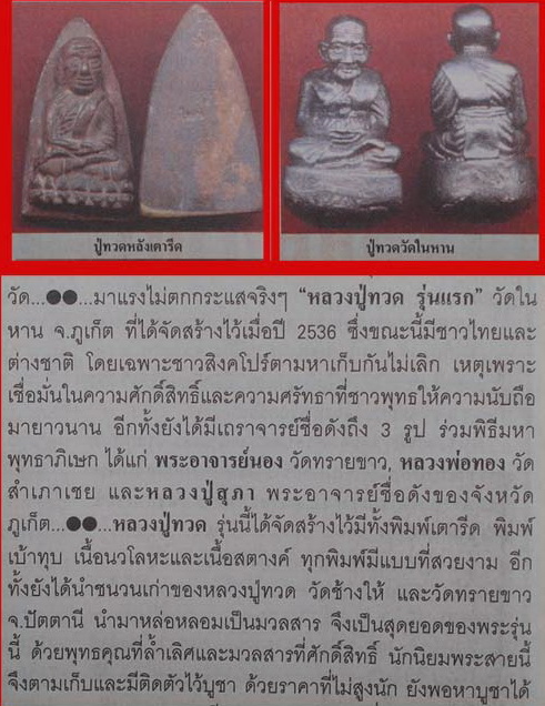 | รายละเอียด | หลวงปู่ทวด วัดในหาน จ.ภูเก็ต รุ่นแรก ปี 36 พิมพ์เบ้าทุบ 3 องค์ เนื้อเปียกทอง เนื้อนวะ เนื้อผิวไฟ อ.นอง อ.ทอง อ.สุภา ร่วมปลุกเสก ปี 36 ตอกโค๊ด 4 โค๊ด "๑" "ในหาน" "ภูเก็ต" "ตัวนะ" |