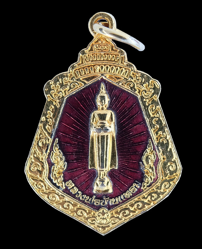 เหรียญโภคทรัพย์ หลวงพ่อวัดบ้านแหลม วัดเพชรสมุทรวรวิหาร เนื้อกะหลั่ยทองลงยาสีแดง พ.ศ.2547