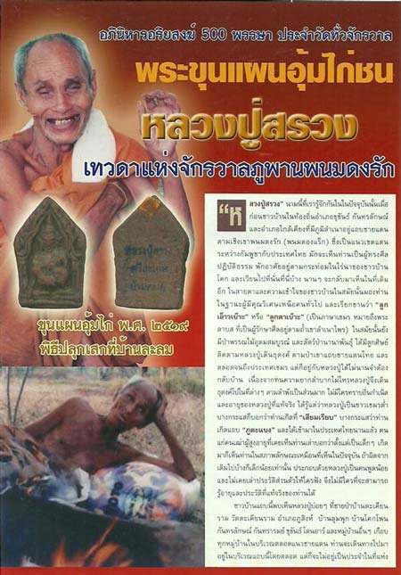 | รายละเอียด | พระขุนแผนมหาเสน่ห์ พิมพ์อุ้มไก่ แช่น้ำมนต์ เนื้อดินดำปราสาทขอมพันปี เทพเจ้าแห่งโชคลาภ หลวงปู่สรวง บ้านละลม จ.ศรีษะเกษ ปี 19 (เนื้อดำหายาก)หลวงปู่สรวง ประวัติโดยย่อ -ถ้าเอ๋ยถึงหลวงปู่สรวงคงไม่มีใครปฏิเสธว่าไม่รู้จัก หลวงปู่เป็นใคร มาจากไหน อายุเท่าไหร่ ไม่มีใครทราบ รู้แต่ว่า อริยะสงฆ์ผู้อยู่เหนือกาลเวลา 500 พรรษา จำวัดทั่วจักรวาล นึกจะมาก็มา นึกจะไปก็ไป ชาวบ้านนับพันนับหมื่นแห่งดินแดนอิสานใต้ตั้งชื่อให้ท่านว่า ผู้วิเศษแห่งภูตะแบง หรือเทวดาเล่นดินนั้นเอง อภินิหารต่างเล่าขานกันมาจากปากต่อปากสื่อสิ่งพิมพ์ตีแพร่เรื่องราวของหลวง ปู่อยู่เรื่อยมาจนถึงปัจจุบัน และเป็นที่กล่าวขานมาจนทุกวันนี้ ปัจจุบันท่านได้ละสังขารนอนนิ่งอยู่ที่โลงแก้ว วัดไพรพัฒนา อ.ภูสิงห์ จ.ศรีสะเกษ โดยท่านละสังขารวันที่ 8 กันยายน 2543 พูดถึงวัตถุมงคลของหลวงปู่เป็นที่นิยมกันอย่างมาก นักเล่นพระต่างเสาะและแสวงหาเพื่อให้ได้มาครอบครองเก็บไว้เป็นศิริมงคลครอบ จักรวาล ในปี 2519 หลวงปู่ได้มาจำพรรษาอยู่ที่วัดถ้ำภูดิน สำนักสงฆ์ภูดินได้จัดสร้างขุนแผนเนื้อดินปราสาทขอมพันปี ซึ่งหลวงปู่ได้ร่วมปลุกเสกกับลูกศิษย์ 1 ไตรมาส และหลังจากนั้นลูกศิษย์ก็ปลุกเสกขุนแผนรุ่นดังกล่าวที่วัดถ้ำภูดินเรื่อยมา จนครบ 11 ปี อาจารย์เสริฐสำนักสงฆ์ตาโคลที่เป็นลูกศิษย์โดยตรง ได้รวบรวมขุนแผนชุดดังกล่าวมาปลุกเสกที่วัดตาโคล 10 ปี ปลุกเสกที่วัดสุทัศน์ 10 ปี (200 พิธีใหญ่ พระร่วมพิธีปลุกเสกนับแสนรูป) พุทธคุณ คงไม่ต้องพูดถึงและบรรยายมาก เช่น เสน่ห์ เมตตามหานิยม ค้าขาย โชคลาภ ฯลฯ ครอบจักรวาล วิธีบูชาพระหลวงปู่สรวงที่ได้ผลดีที่สุดให้จุดธูป 9 ดอก บูชาด้วยดอกว่านมหาหงส์ 5 คู่ ด้วยยิ่งดี หรือถ้าไม่มีก็ดอกไม่ขาวทั่วไป ผ้าขาววาหนึ่ง เงิน 6 บาท เทียนหนักเล่มบาท 1 คู่ เทียนเล็ก 5 คู่ ตั้งนะโม 3 จบ แล้วบอกกล่าวท่านเป็นภาษาเขมรว่า “หลวงปู่สรวง ออยเตียนสะลูน ออยเพิ่มพูน บายตึกเจีย ข้าพเจ้า (……บอกชื่อตัวเอง…….) ขอให้หลวงปู่สรวงได้รับรู้ด้วยเครื่องสักการบูชานี้ และช่วยเหลือให้ข้าพเจ้า……(ขอในสิ่งที่ต้องการ)…… ด้วยบารมีของหลวงปู่สรวงด้วยเทอญ” ว่ากี่จบก็ได้ หลายจบยิ่งดี ถ้าจะให้เห็นผลสำเร็จภายในเร็ววันให้ภาวนาคาถานี้ทุกวัน ให้ทำด้วยความตั้งใจและความศรัทธา จากคำบอกเล่าผู้ที่เช่าไป ขอได้สำเร็จ บางคนต้องกลับมาเช่าเพิ่มเพื่อเก็บสะสมไว้เป็นศิริมงคล นำไปขึ้นคอและอธิฐานขอให้หลวงปู่ช่วยนะครับ |