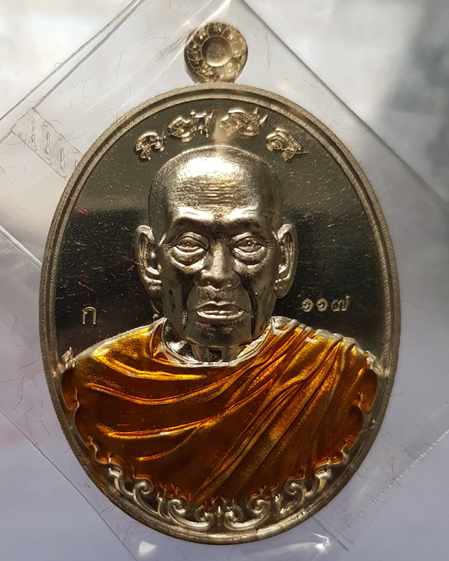 เหรียญรวยไม่หยุด หลวงพ่อพัฒน์ วัดห้วยด้วน เนื้ออัลปาก้าลงยาจีวร ตอกโค๊ดและหมายเลข 117 พร้อมกล่องเดิม