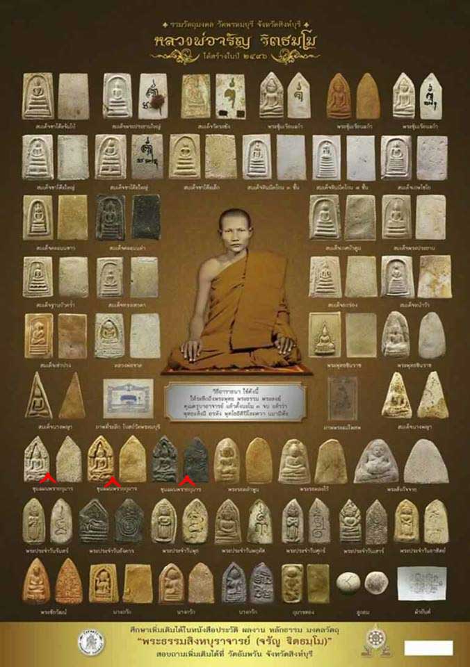 | รายละเอียด | ...หลวงพ่อจรัญ ฐิตธัมโม หรือพระธรรมสิงหบุราจารย์ เจ้าอาวาสวัดอัมพวัน อ.เมือง จ.สิงห์บุรี ...แม้ท่านไม่ใช่พระสงฆ์ที่มีชื่อเสียงในด้านวิชาอาคม แต่เน้นไปในทางการสอนปฏิบัติธรรมกรรมฐาน แต่ตามประวัติของท่านนั้นไม่ธรรมดา เพราะศึกษาสรรพวิชาจากอดีตเกจิอาจารย์ดังหลายรูปเช่นกัน ...หากกล่าวในเรื่องวัตถุมงคลแล้ว หลวงพ่อจรัญท่านไม่นิยมสร้าง หรือชี้นำให้ญาติโยมพุทธศาสนิกชนหลงใหลได้ปลื้ม ตรงกันข้าม ท่านจะสั่งสอนให้เชื่อในเรื่องของ “กรรม” และการปฏิบัติตามคำสั่งสอนขององค์พระสัมมาสัมพุทธเจ้า ...แต่ในความเป็นจริงนั้น พระเครื่องหรือวัตถุมงคลของหลวงพ่อจรัญแทบทุกชนิดเป็นที่เสาะหาของบรรดาศิษยานุศิษย์อย่างยิ่ง โดยเฉพาะยุคแรกๆ เช่น เหรียญรูปเหมือนรุ่นแรก, พระพุทธนฤมิตรโชค หรือ “พระสมเด็จกวาง” ฯลฯ. ...“พระเครื่องชุดวัดพรหมบุรี” ที่ท่านสร้างไว้เมื่อครั้งพำนักอยู่วัดพรหมบุรี อ.พรหมบุรี จ.สิงห์บุรี ซึ่งถือว่าเป็น “รุ่นแรก” ที่แท้จริงของท่าน ...มูลเหตุแห่งการสร้าง พระชุดนี้สร้างเมื่อปี๒๔๙๖ สมัยที่ท่านยังอยู่วัดพรหมบุรี ซึ่งไม่ไกลจากวัดอัมพวัน ครั้งนั้นวัดพรหมบุรีได้ดำเนินการสร้างโบสถ์ หลวงพ่อท่านมีดำริที่จะสร้างพระไว้แจกแก่ญาติโยมที่มาช่วยบริจาค ท่านได้ไปขอความเมตตาต่อพระราชโมลีอดีตเจ้าอาวาสวัดระฆังฯ ขอให้เป็นเจ้าพิธีในการจัดสร้าง พระราชโมลีได้มอบมวลสารผงของสมเด็จฯโตที่เก็บไว้และได้ออกหนังสือรับรองให้เมื่อวันที่ ๑๓ พฤศจิกายน พศ.๒๔๙๕ ...นอกจากนั้นยังมีผงเก่าๆ ที่ท่านได้รวบรวมไว้เช่น 1.ผงพุทธคุณของหลวงพ่อเดิม วัดหนองโพ ซึ่งเป็นอาจารย์ของท่าน 2.ผงพุทธคุณของหลวงพ่อจันทร์ วัดนางหนู 3.ผงพุทธคุณของหลวงพ่อเงิน วัดบางคลาน 4.ผงพุทธคุณของหลวงพ่อเชย วัดปากน้ำ (หรือวัดท่าควาย) 5.ผงธูปจากสถานที่ศักดิ์สิทธิ์ต่างๆ อาทิ วัดพระพุทธชินราช, วัดโสธร, วัดพระพุทธบาทสระบุรี, วัดนางพญา พิษณุโลก, วัดพระนอนจักรสีห์ ...เมื่อรวบรวมผงที่นำมาสร้างพระแล้วได้นำมาสร้างเป็นพระพิมพ์ทั้งหมด ๓๘ พิมพ์ทรง อาทิ พระสมเด็จฯ ๗ ชั้น, พระสมเด็จฯ ๓ ชั้น, พระสมเด็จฯคะแนน, ขุนแผน, พระสังกัจจายน์, พระนางพญา, พระปางประจำวัน, นางกวัก, พระรอดเนื้อผง, พระชัยวัฒน์เนื้อผง และลูกอม ฯลฯ. แต่ละพิมพ์สร้างไม่มาก ลักษณะของพระชุดนี้เนื้อพระจะแกร่ง เนื้อละเอียดค่อนข้างใส จึงเรียกพระชุดนี้ว่าพระสมเด็จเนื้อหินมีดโกน แล้วจึงนำไปให้หลวงพ่อจาด วัดบางกระเบา ปลุกเสกเป็นปฐมฤกษ์ เมื่อวันที่ ๙ มกราคม ๒๔๙๖ เสร็จแล้วนำมาปลุกเสกอีกทีที่วัดพรหมบุรีในวันที่ ๑๙ มก