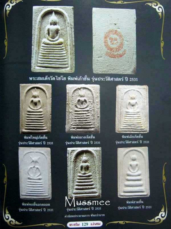 | รายละเอียด | ..ประวัติจัดสร้าง.. ..ที่วัดไชโยวรวิหาร อ่างทอง หลวงพ่อพระมหาพุทธพิมพ์(หลวงพ่อโต) สร้างโดยสมเด็จพระพุฒาจารย์ฯ(โต พรหมรังษี) เมื่อร้อยกว่าปีเศษมาแล้ว องค์เดิมนั้นได้ลงรักปิดทอง แต่กาลเวลาผ่านมาถึงเจ้าอาวาสรูปหนึ่ง เมื่อปี พ.ศ. ๒๔๗๐ ท่านมีความประสงค์ที่จะลงรัก ปิดทองใหม่ จึงได้ทำการลอกทองออกจากองค์พระ ต่อมาท่านได้ออกไปเรี่ยไร เพื่อนำปัจจัยมาซื้อทองปิดองค์หลวงพ่อ แต่แล้วท่านได้มรณภาพไปเสียก่อน นับแต่นั้นมาจนถึงปี ๒๕๓๑ ท่านเจ้าอาวาสขณะนั้นคือ พระวิสิฐนิมมานการ (แฉล้ม จนทวณโณ) ได้เริ่มที่จะปิดทององค์หลวงพ่อพระมหาพุทธพิมพ์อีกครั้งหนึ่ง เหตุการณ์มหัศจรรย์ได้ปรากฏขึ้นคือ องค์หลวงพ่อพระมหาพุทธพิมพ์ได้ไปเข้าฝัน ดร.เถลิง เหล่าจินดา (พ่อค้าชาวอ่างทองโดยกำเนิด) บอกว่าขณะนี้ยังไม่ได้ปิดทอง ดังนั้นท่านเจ้าอาวาส และดร.เถลิง เหล่าจินดา พร้อมด้วยข้าราชการ พ่อค้า ประชาชน จึงร่วมกันทำพิธีลงรักปิดทอง และได้ทำพิธีกะเทาะ ลอกทองเก่าออกจากองค์หลวงพ่อพระมหาพุทธพิมพ์ก่อน ขณะที่ทำการกะเทาะองค์อยู่นั้น ท่านเจ้าอาวาสได้นิมิตว่า สมเด็จพระพุฒาจารย์โต มาบอกว่าผง และทองคำ ที่เอาออกจากองค์นั้นควรจะนำไปสร้างพระสมเด็จฯ (ทองคำนำไปผสมทำพระทองคำ) เพื่อให้ประชาชนได้นำไปสักการะบูชา ...ท่านเจ้าอาวาสจึงได้นำเรื่องไปปรึกษากับคณะกรรมการวัด และพร้อมใจกันสร้างพระสมเด็จฯรุ่นนี้ขึ้นมา ใช้ชื่อว่า สมเด็จฯรุ่นประวัติศาสตร์...ที่ให้ชื่อนี้เพราะว่าโอกาสที่จะนำผงจากองค์หลวงพ่อพระมหาพุทธพิมพ์ มาทำผงพระสมเด็จฯคงไม่มีอีกแล้วในชีวิตพวกเรา.. ... ก่อนที่จะทำการสร้างพระสมเด็จฯชุดนี้นั้น นายช่างทำพระสมเด็จฯได้ปรารภกับท่านเจ้าอาวาสว่า ถ้าได้พระศกมาผสมกับผงอีกก็จะทำให้เพิ่มพุทธานุภาพของพระสมเด็จฯชุดนี้มากยิ่งขึ้น ในอดีตพระศกขององค์หลวงพ่อพระมหาพุทธพิมพ์ เคยล่วงมาแล้วในปี ๒๕๒๑ จำนวน ๑ ชิ้น และ พ.ศ.๒๕๓๑ ช่างมาสำรวจ ปรากฏว่าชำรุดอีก ๑ ชิ้น ท่านเจ้าอาวาสเลยตั้งกัลยาจิตอธิษฐานว่า ถ้าจะทำพระสมเด็จฯชุดนี้สำเร็จแล้ว ขอให้หลวงพ่อพระมหาพุทธพิมพ์ประทานเพิ่มพระศกอีก ปรากฏว่าเมื่อสำรวจแล้วครั้งสุดท้ายก่อนซ่อมองค์หลวงพ่อฯ มีพระศกชำรุด ๔๗ ชิ้น ดังนั้น ท่านเจ้าอาวาส และคณะกรรมการของวัดจึงได้จัดทำพิธีมหาพุทธาภิเษกเมื่อวันที่ ๒๐ ตุลาคม พ.ศ. ๒๕๓๑ ตรงกับวันพฤหัสบดี ขึ้น ๑๐ ค่ำ เดือน ๑๑ โดยอาราธนาพระเกจิอาจารย์ทั่วประเทศ จำนวน ๑๐๘ รูป มาร่วมพิธี โดยมีสมเด็จฯพระญาณสังวรฯ(เจริญ) วัดบวรนิเวศฯ เป็นพระประธานจุดเทียนชัย.. ...มีสร้างด้วย
