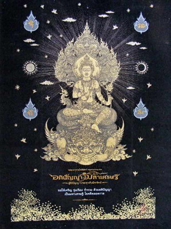 อภิปัญญามหาเศรษฐี พุทธศิลป์ในรูปแบบของ อ.เฉลิมชัย โฆษิตพิพัฒน์ ผ้ายันต์สีดำ ผืนเล็ก ขนาด 18x26 นิ้ว