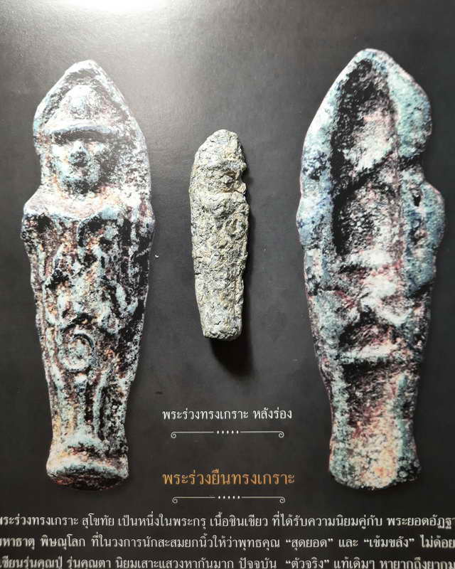 | รายละเอียด | เมื่อประมาณ พ.ศ.๒๔๘๕ ช่วงสงครามโลกครั้งที่ ๒ ที่องค์พระปรางค์ด้านทิศใต้ของวัดพระศรีรัตนมหาธาตุ อ.สวรรคโลก จ.สุโขทัย ได้มีการขุดค้นพบ พระร่วงพิมพ์ยืน ที่สร้างขึ้นยุคหลัง โดยช่างสกุลฝีมือชาวบ้าน เป็นพระที่สร้างด้วย เนื้อชินเขียว ล้วนๆ มีมากแบบ มากพิมพ์ ทั้งหลังร่อง หลังยันต์ หลังเรียบ หลังลายผ้า หลังรางปืน หลังกากบาท (X) และพิมพ์พิเศษ ๒ หน้า เท่าที่ขุดพบมีจำนวนกว่าสิบพิมพ์ ในวงการพระเครื่องเรียกพระพิมพ์นี้ว่า “พระร่วงยืนทรงเกราะ” มี ๓ พิมพ์ทรง คือ พิมพ์ใหญ่ พิมพ์กลาง และพิมพ์เล็ก ขณะเดียวกัน ในกรุนี้ยังขุดพบ พระพิมพ์นั่ง เนื้อชินเขียว อีกด้วย เรียกชื่อว่า “พระร่วงนั่งทรงเกราะ” พุทธศิลป์ของพระร่วงยืน เป็นพระปางประทับยืน สวมหมวกจีโบ (ชีโบ) ศิลปะขอม ยก ๒ พระหัตถ์เสมอพระอุระ ปางประทานธรรม มีอักขระยันต์ขอม ลักษณะเป็นเส้นนูน อยู่บนองค์พระ องค์พระมีลักษณะทรวดทรงคล้ายกับ “นักรบสวมเกราะ” ในสมัยโบราณ จึงเป็นที่มาของชื่อ “พระร่วงยืนทรงเกราะ” บางพิมพ์มีลักษณะคล้าย “มัมมี่” ในสมัยอียิปต์โบราณจึงมีการเรียกอีกชื่อหนึ่งว่า พระร่วงยืน “พิมพ์มัมมี่” เป็นเนื้อโลหะผสม ระหว่าง ดีบุก ตะกั่ว สังกะสี พลวง เหล็ก ปรอท และเงิน มารวมกัน เนื้อพระจะมีความแข็ง คงทน ไม่สึกง่าย และจะไม่มีรอยระเบิด หรือรอยรานแตกร้าวปรากฏให้เห็น วงการพระเรียกเนื้อพระลักษณะนี้ว่า “ชินเขียว” พระเนื้อชินเขียวนี้ จะมีสนิมไขมันใสเป็นเม็ด คล้ายไข่แมงดา เรียกว่า สนิมไข่แมงดา เกาะติดฝังลึกแน่น จากในเนื้อองค์พระออกมา พร้อมมีฝ้าสีเหลืองอ่อน ปกคลุมทั่วองค์พระ และมีสนิมปานดำ หรือ “กระ” ที่มีสีเข้มเป็นจุดดำเกิดขึ้นเป็นจุดๆ เป็นปื้นกินลึกเข้าไปในเนื้อโลหะ ซึ่งไม่สามารถขัดถูออกได้ ถือเป็นจุดตายในการพิจารณาเนื้อพระเนื้อชินเขียวได้ในระดับหนึ่ง พระเนื้อชินเขียว มีชื่อเรียกอีกอย่างหนึ่งว่า ชินอุทุมพร คำว่า อุทุมพร แปลว่า มะเดื่อ ซึ่งไม่น่าจะเกี่ยวกับเนื้อหาของพระเนื้อชินเขียวนี้เลย แต่เดิมมาในวงการพระเครื่อง มีเรื่องเก่าเล่าขานว่า “อุทุมพร” น่าจะเป็นพระนามของอดีตพระมหากษัตริย์ไทย ในสมัยกรุงศรีอยุธยาตอนปลาย ก่อนที่จะเสียกรุงครั้งที่ ๒ ทรงเป็นกษัตริย์ที่มีฝีมือในเชิงรบเป็นเลิศ จนยากที่จะหาผู้ใดมาราวี เป็นกษัตริย์ยอดนักรบในสมัยนั้น ท้ายสุด พระองค์ทรงสละราชสมบัติ และออกผนวช จึงมีการเรียกขานนามพระเนื้อชินเขียวว่า ชินอุทุมพร เพื่อเป็นอนุสติ และทรงไว้ซึ่งพระนาม ของขลัง ในหัวใจของคนไทยยุคต่อมา ด้านหลังของพระร่วงพิมพ์นี้ บ