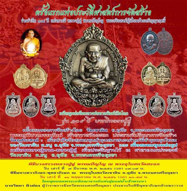 | รายละเอียด | ครั้งแรกแห่งประวัติศาสตร์การจัดสร้าง ร่วมรำลึก ๑๐๙ ปี แห่งบารมี หลวงปู่ดู่ พรหมปัญโญ พระอริยสงฆ์ผู้เปี่ยมด้วยอภิญญาฤทธิ์ ครั้งแรกของการจัดสร้างโดย วัดเขาดิน อ.อุทัย จ.พระนครศรีอยุธยา พระครูพิศาลธรรมรักษ์ เจ้าอาวาสวัดสะแก ประธานที่ปรึกษาการจัดสร้าง วัตถุประสงค์ : เพื่อนำปัจจัยสมทบทุนบำรุงเสนาสนะเก่าแก่ที่ชำรุดทรุดโทรมของวัดเขาดิน ต.ธนู อ.อุทัย จ.พระนครศรีอยุธยา และ เพื่อสมทบทุนหล่อรูปเหมือนหลวงปู่ทวด-หลวงปู่ดู่ เพื่อประดิษฐานไว้ ณ ศาลาอเนกประสงค์ วัดเขาดิน ต.ธนู อ.อุทัย จ.พระนครศรีอยุธยา พิธิบวงสรวงหลวงปู่ดู่ พรหมปัญโญ ณ พระอุโบสถวัดสะแก วันเสาร์ ที่ ๙ มีนาคม พ.ศ. ๒๕๕๖ เวลา ๐๙.๐๙ น. พิธีมหาเทวาภิเษก-พุทธาภิเษก ณ พระอุโบสถวัดเขาดิน อ.อุทัย จ.พระนครศรีอยุธยา วัน เสาร์ ที่ ๑๑ พฤษภาคม พ.ศ.๒๕๕๖ เวลา ๑๓.๕๙ น. โดยสุดยอดพระเกจิคณาจารย์แห่งลุ่มแม่น้ำเจ้าพระยา นายวิทยา ผิวผ่อง ผู้ว่าราชการจังหวัดพระนครศรีอยุธยา ประธานในพิธีพุทธาภิเษกฝ่ายฆราวาส หลวงปู่ดู่ พรหมปัญโญ หลวงปู่ดู่ พรหมปัญโญ มีชาติกำเนิดในสกุล "หนูศรี"เดิม ชื่อ ดู่ เกิดเมื่อวันที่ ๒๙ เมษายน พ.ศ. ๒๔๔๗ ตรงกับวันศุกร์ขึ้น ๑๕ ค่ำ เดือน ๖ ปีมะโรง ซึ่งตรงกับวันวิสาขบูชา ณ บ้านข้าวเม่า ตำบลข้าวเม่า อำเภออุทัย จังหวัด พระนครศรีอยุธยา เมื่อท่านอายุได้ ๒๑ ปี ก็ได้เข้าพิธีบรรพชาอุปสมบทเมื่อวันที่ ๑๐ พฤษภาคม พ.ศ. ๒๔๖๘ ตรงกับวันอาทิตย์แรม ๔ ค่ำ เดือน ๖ ณ วัดสะแก ตำบลธนู อำเภออุทัย จังหวัด พระนครศรีอยุธยา โดยมี หลวงพ่อกลั่น เจ้าอาวาสวัดพระญาติการาม เป็นพระอุปัชฌาย์ หลวงพ่อแด่ เจ้าอาวาสวัดสะแก ขณะนั้นเป็นพระกรรมวาจาจารย์ และหลวงพ่อฉาย วัดกลางคลองสระบัว เป็นพระอนุสาวนาจารย์ ได้รับฉายาว่า “พรหมปัญโญ”พรรษาแรกนั้น ท่านได้ศึกษา พระปริยัติธรรมที่วัดประดู่ทรงธรรมซึ่งในสมัยนั้นเรีกว่า วัดประดู่โรงธรรม โดยมีพระอาจารย์ผู้สอนคือ ท่านเจ้าคุณเนื่อง พระครูชม และ หลวงพ่อรอด(เสือ) เป็นต้น ด้านการปฏิบัติพระกรรมฐานนั้น ท่านได้ศึกษากับหลวงพ่อกลั่น ผู้เป็นอุปัชฌาย์ และหลวงพ่อเภา ศิษย์องค์สำคัญของหลวงพ่อกลั่น ซึ่งมีศักดิ์เป็นอาของท่าน เมื่อท่านบวงได้พรรษาที่สองประมาณปลายปี พ.ศ.๒๔๖๙ หลวงพ่อกลั่นมรณภาพ ท่านจึงได้ศึกษาหาความรู้จากหลวงพ่อเภา เป็นสำคัญ นอกจากนี้ท่านยังได้ศึกษาจากตำรับตำราที่มีอยู่จากชาดกบ้าง จากธรรมบทบ้าง และด้วยความที่ท่านเป็นผู้ใฝ่รู้รักการศึกา ท่านจึงได้เดินทางไป ศึกษาหาความรู้เพิ่มเติมจากพระอาจารย์อีกหลายท่านที่ จังหวัดสุพรรณบุรี และ สระบุร