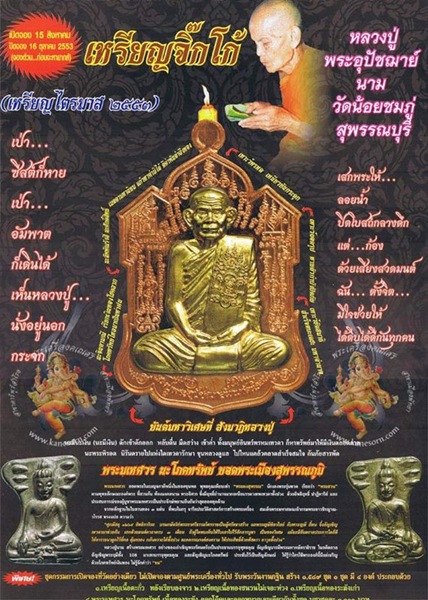 | รายละเอียด | เหรียญจิ๊กโก๋ไตรมาส 53 หลวงปู่นาม วัดน้อยชมภู่ เนื้อตะกั่วหน้าทองฝาบาตร หมายเลข 2162 สภาพสวย กล่องเดิม จำนวนจัดสร้างจำนวน 2553 องค์ พร้อมกล่องเดิม สวยงาม สร้างน้อย หายาก ***********************************************เหรียญ จิ๊กโก๋ เรียกพี่ มาถึงเหรียญ ที่มีอายุประมาณ 1 ปี คือหลวงปูจัดสร้างมาเมื่อต้นปี 2553 น่ะครับ เหรียญนี้ ค่อนข้างมีน้ำหนักมากสักหน่อย ไม่เหมาะกับผู้หญิง หรือคนตัวเล็กหรอกครับ เพราะว่าใหญ่มาก แต่ที่นำมาแนะนำวันนี้เพราะเป็นเหรียญที่สวยจริงๆ อีกทั้งพุทธคุณก็แรงจริงครับ รุ่นนี้ เป็นไงมาไง สำหรับเหรียญ จิ๊กโก๋ ของหลวงปู่นาม ข้อมูลก็มาจากโบว์โชว์น่ะครับ มาอ่านกันดูนะครับ และค่อยหาเก็บสะสม เหรียญจิ๊กโก๋ เป็นเหรียญที่โตเหลือเกิน ประวัติการสร้างก็ตื่นเต้นไม่เบา เพราะเหรียญนี้กรรมการคิดสร้างก่อนเหรียญรุ่นแรกของหลวงปู่ด้วยซ้ำ แต่พอปั้มเหรียญออกมาแล้ว โรงงานบอกว่า ราคาเหรียญนึงเป็นร้อย กรรมการก็หน้าถอดสี เพราะแพงเหลือเกิน ตอนนั้นหลวงปู่นามไม่มีใครรู้จัก และที่ีวัดน้อยชมภู่ก็ไม่มีเงินสร้างเหรียญแพงอย่างนี้ได้เลย เหรียญนี้จึงพับไว้ก่อน เกิดเหรียญรุ่นแรกที่มีประสบการณ์ พอเหรียญรุ่นแรกออกไปคนก็รู้จักหลวงปู่มากขึ้น คนก็รู้ว่าหล่วงปู่ท่านเก่งจริง ท่านมุ่งมั่น และเรียนวิชาแรงจริง ที่สำคัญ ท่านทำได้ ชนิดที่หาเกจิปัจจุบันนี้ทำได้ยาก เพราะจิตท่านถึง วัดน้อยจึงเริ่มมีทุน จึงเอาเงินไปสั่งทำเหรียญจิ๊กโก๋ขึ้นมา เพราะถ้าไม่สั่งโรงงานจะคิดค่าพิมพ์แพง พอสั่งมาหลวงปู่ก็เก็บไว้ในลังเหล็ก ปลุกเสกในกุฏิ ตั้งแต่ปลายปี 2552 หลวงปู่ท่านเสกของฟทุกวัน วันละหลายๆรอบ ตามฤกษ์ที่ท่านเห็นสมควร บอกเล่าเรื่องแปลก มีอยู่ว่า เมื่อวันที่ 20 มีนาคม 2553 ตรงกับวันเสาร์ ๕ ลังเหล็กที่ใส่เหรียญจิ๊กโก๋ก็ถูกขนไปด้วย แต่เบื้องหลังคือเด็กหนุ่ม 2คน ยกลังเหล็กที่ใส่เหรียญจิ๊กโก๋ไม่ขึ้น เพราะหนักมาก ก็เข้าใจได้เพราะ เหรียญใหญ่ใส่ลังเหล็กเป็นหลายร้อยเหรียญ ก็ยกเหล็กดีๆนี่แหละ น้ำหนักก็หลายร้อยกิโล เรียกผู้ชายมาช่วยอีกก็ยกไม่ขึ้น จึงร้องบอกกันว่าต้องทยอยขนไปในโบสถ์ หิ้วคนละถุงสองถุง กำลังหากุญแจเปิดลังอยู่ หลวงปู่ท่านนั่งอยู่หน้ากุฎิก็ถามว่า หาอะไร เด็กหนุ่มเรียนท่านว่า หากุญแจ เปิดหีบเหล็ก ท่านบอกว่าก็ยกมันทั้งใบเลยสิ ก็ตอบหลวงปู่ไปว่า มันหนักยกไม่ขึ้น หลวงปู่ ท่านก็หัวเราะ ตอบว่า อะไร หนุ่มๆตั้งหลายคนยังยกไม่ขึ้น แล้วท่านก็เดินเข้าห้อง หลับตานิดเดียว เอามือแตะลังเหล็กลังเดิม เบาๆ ท่านบอกกับเด็กหนุ่มที่ยืนตรงนั้นว่า 