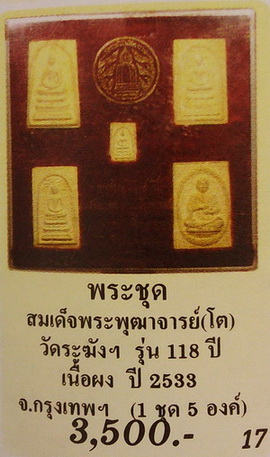 | รายละเอียด | พระชุด 5 องค์ พระสมเด็จวัดระฆัง รุ่น อนุสรณ์ 118 ปี พ.ศ.2533 พระอยู่ในสภาพสวยงาม ไม่ผ่านการบูชา พร้อมกล่องเดิมๆจากวัด เก็บทีเดียวได้ครบชุด 5 องค์ รับรองไม่จมเงิน ไม่ขาดทุนแน่นอน อนาคต ราคาขึ้นไม่มีหยุดแน่นอน เหมือนเก็บทองคำครับ ประวัติการสร้าง : เนื่องด้วยในวันที่ 22 มิถุนายน พุทธศักราช 2533 อันเป็นวันคล้ายวันมรณภาพของเจ้าประคุณสมเด็จพุฒาจารย์ (โต พฺรหฺมํรังสี) ครบรอบ 118 ปี ซึ่งมาถึงอีกครั้งหนึ่ง ทางคณะกรรมการวัดระฆังโฆสิตารามพร้อมด้วยบรรพชิตและฆราวาสมีความเห็นพ้องต้องกันว่า จะจัดสร้างวัตถุมงคลรุ่นอนุสรณ์ครบรอบวันคล้ายวันมรณภาพของท่านเจ้าประคุณสมเด็จพุฒาจารย์ (โต พฺรหฺมํรังสี) ซึ่งเวียนมาบรรจบครบรอบ 118 ปีในคราวนี้ ทั้งนี้ปัจจัยที่ได้ทั้งหมดนำไปใช้เป็นทุนทรัพย์สำหรับกิจการงานต่างๆ ของมูลนิธิเจ้าประคุณสมเด็จพุฒาจารย์ (โต) เพื่อบูรณะศาลาการเปรียญของวัดซึ่งเป็นโบราณสถานของชาติแห่งหนึ่งให้คงสภาพเดิม และจัดสร้างศาลาเอนกประสงค์เพื่อเป็นถาวรวัตถุรำลึกถึงเจ้าประคุณสมเด็จพุฒาจารย์ (โต)อีกส่วนหนึ่งด้วย วัตถุมงคลรุ่นอนุสรณ์ 118 ปี สมเด็จพุฒาจารย์ (โต) ซึ่งจัดสร้างขึ้นในครานี้มีด้วยกันหลายลักษณะดังเช่นทุกครั้งที่ผ่านมา ทั้งพระพุทธรูปบูชา พระรูปเหมือนขนาดบูชา พระรูปเหมือน รูปเหมือนหยดน้ำ พระผงลักษณะต่างๆ และเหรียญปั๊มต่างๆ เป็นต้น การจัดสร้างวัตถุมงคลรุ่นอนุสรณ์ 118 ปี กระทำเป็นพิธีสุดยิ่งใหญ่ดั่งเช่นทุกครั้งที่ผ่านมาทั้งพิธีสงฆ์และพิธีพราหมณ์ โดยพิธีสงฆ์ สมเด็จพระญาณสังวร สมเด็จพระสังฆราช ทรงเป็นประธานจุดเทียนชัย และประธานนั่งปรกเจริญภาวนาประกอบพิธีมหาพุทธาภิเษก ร่วมกับคณาจารย์ทั่วประเทศกว่า 118 รูป ภายในอุโบสถวัดระฆังโฆสิตาราม เมื่อวันที่ 22 มิถุนายน พ.ศ.2533 โดยมี สมเด็จพระญาณสังวร สมเด็จพระสังฆราชฯ ทรงเป็นประธานจุดเทียนชัย มีพระเกจิอาจารย์นั่งปรกอธิษฐานจิตปลุกเสกถึง 89 รูปที่โดดเด่น คือ พระภาวนาโกศลเถระ (วีระ) วัดปากน้ำภาษีเจริญ กทม, พระญาณโพธิ (เข็ม) วัดสุทัศน์ฯ กทม, พระปลัดธรรมจริยวัฒน์ (วิเชียร) วัดดวงแข กทม,พระครูจันทคุณาภรณ์ (จำปา) วัดอินทราวาส กทม, พระครูวิบูลยศีลวัตร (ช้วน) วัดหนัง กทม, พระครูวิมลธรรมธาดา (ถวิล) วัดลาดบัวขาว กทม, พระครูสุทธิธรรมาจารย์ (คอน) วัดชัยพฤกษ์มาลา กทม, พระครูอุดมโชติวัฒน์ (อรรถ) วัดองครักษ์ สุพรรณฯ, พระครูสุนทรสุวรรณกิจ (ดี) วัดพระรูป สุพรรณฯ, พระครูศรีฉฬังคสังวร (เริ่ม) วัดจุกกระเฌอ ชลบุรี, พระครูสารทรพัฒนกิจ (ละมูล) วัดเสด็จ ปทุมฯ, พระครูเกษมธรรมนันท์ (แช่ม) วัดดอนยายหอ