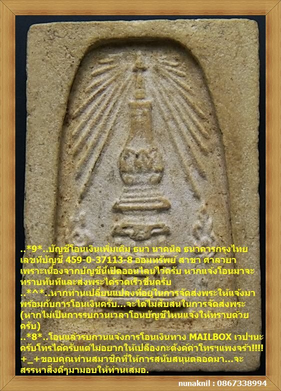 | รายละเอียด | เหรียญหลวงปู่พรหมสร(รอด)พระเกจิสายอีสานผู้บุกเบิกบูรณะพระเจดีย์พระธาตุพนม จ.นครพนม และยังเป็นผู้สร้างเสกเหรียญพระธาตุพนมรุ่นแรกๆอันโด่งดังทั่วฟ้าเมืองไทยและพี่น้องชาวลาวด้วยคร๊าบ กล่าวถึงพระธาตุพนมเป็นที่ซึ่งบรรจุพระอุรังคธาตุ(ส่วนหน้าอก)ของพระพุทธเจ้าช่วงเทศกาลนมัสการพระเกจิทั่วประเทศต้อง...ใช้คำว่า..ต้องเดินทางไปนมัสการทุกๆปี..ขอย้ำว่าต้องเดินทางไปนมัสการทุกๆปีคร๊าบ..มีเรื่องเล่าว่าขนาดนำเหรียญพระธาตุพนมไปให้หลวงพ่อคูณท่านเสกท่านยังจับออกมาวางไว้ต่างหากและกล่าวว่า "เหรียญนี้กูไม่เสกให้ดอก เพราะเหรียญนี้ดีอยู่แล้ว" คำกล่าวนี้ได้ยินมากับหูคร๊าบเพราะญาติผมเป็นคนนำพระเครื่องต่างๆไปให้หลวงพ่อคูณท่านเสกซ้ำอีก แต่พอท่านเห็นเหรียญพระธาตุพนมทั้งที่ไม่ใช่รุ่นแรกนะคร๊าบท่านยังหยิบออกมาวางไว้ข้างนอกและกล่าวคำดังกล่าวข้างต้นคร๊าบ...ไม่ได้โม้...เอาเป็นว่าเหรียญหลวงปู่พรหมสร(รอด)เหรียญนี้สภาพเดิมกริ๊ปๆจร้า เนื้อทองแดงๆแปร๊ดๆ แลเข้มขลัง...เสียดายไม่ทราบที่เอาเป็นว่าปิดเบาๆสำหรับสมาชิกที่ศรัทธาหลวงปู่คร๊าบ... คำเตือน : จงรักษาความไม่ประมาทเสมอด้วยชีวิต...นะจร๊ะสิบอกไห่. กรณีที่ท่านชนะการประมูลนั้น...หากท่านสะดวกในการโอนเงินเข้าบัญชี กรุณาโอนเงินเข้าบีญชีดังต่อไปนี้นะครับ... เพิ่มเติมบัญชีโอนเงิน นายธนา นาคนิล ธนาคารกรุงไทย ออมทรัพย์ เลขที่459-0-37113-8 สาขาศาลายา หมายเหตุ : บัญชีนี้จะสะดวกเพราะถ้าลูกค้าโอนเงินเข้าจะทราบทันทีเพราะผมเปิดออนไลน์ไว้ และจัดส่งพระได้รวดเร็ว... ขอบคุณครับ ปล.หากท่านต้องการเปลี่ยนที่อยู่จัดส่งกรุณาแจ้งทางกล่องข้อความพร้อมกับแจ้งการโอนเงินนะคร๊าบ...โทรฯได้ครับแต่ไม่อยากให้เปลืองสะตังค์ค่าโทรฯครับมันแพง...แจ้งทางกล่องข้อความก็ได้คร๊าบเพราะผมเปิดตลอดคร๊าบบบบ...จะได้ไม่ต้องมาจ่ายค่าโทรฯคร๊าบบบ.ขอบคุณคร๊าบ*-^-* |