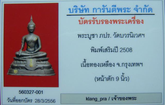 | รายละเอียด | พระบูชา 9 นิ้ว พระบูชา ภ.ป.ร. 08 หน้าตัก9นิ้ว สมเด็จพระศรีนครินทราบรมราชชนนี ได้นำพระพุทธรูป ภ.ป.ร. ของวัดเทวสังฆราม หรือ ที่นิยมเรียกว่า พระพุทธรูป ภ.ป.ร. รุ่น พระกฐินต้น ไปพระราชทานหน่วยทหาร – ตำรวจ และหน่วยงานราชการ อีกหลายแห่ง เป็นที่ชื่นชมยินดีเป็นอันมาก รวมทั้ง พ่อค้า ประชาชน ยังมีความต้องการ ประสงค์อยากมีไว้สักการบูชาอีกเป็นจำนวนมาก พระองค์จึงได้พระราชทานพระดำริ ว่าน่าจะมีการสร้างขึ้นมาอีกครั้ง ณ วัดบวรนิเวศวิหาร เพื่อสนองความต้องการของผู้ศรัทธา โดยเหตุนี้จึงได้มีการตั้งคณะกรรมการสร้างพระพุทธรูป ภ.ป.ร. ขึ้นมาอย่างเป็นทางการ ถือเป็นงานใหญ่ระดับชาติ เมื่อเดือนกันยายน พ.ศ. 2507 มี จอมพล ถนอม กิตติขจร นายกรัฐมนตรี เป็นประธานร่วมด้วยกรรมการจากหน่วยงานราชการ สถาบันต่าง ๆ แล้วตั้งเป็นคณะอนุกรรมการฝ่ายต่าง ๆ เพื่อดำเนินการในส่วนที่เกี่ยวข้อง พระพุทธรูป ภ.ป.ร. ที่สร้างขึ้นในครั้งนี้ เดิมคณะกรรมการจะจัดสร้างตามแบบพระพุทธรูป ภ.ป.ร. รุ่น พระกฐินต้น วัดเทวสังฆาราม ทุกประการ แต่เมื่อคณะกรรมการได้นำพระพุทธรูป ที่ออกแบบสร้างแล้วขึ้นทูลเกล้าฯถวาย ทรงพระมหากรุณาธิคุณฯ แก้ไขเปลี่ยนแปลงแบบให้ถูกต้องเหมาะสมกับพระพุทธลักษณะยิ่งขึ้น ด้วยพระบรมราชวินิจฉัยของพระองค์เอง พระองค์ทรงมีพระบรมราชวินิจฉัย แก้ไขพุทธลักษณะคล้ายคลึงใกล้เคียงไปทางพระพุทธรูปสมัยสุโขทัยเป็นอันมาก นอกจากนี้ยังได้พระราชทานภาษิต สำหรับจารึกไว้ที่ฐานด้านหน้า เพื่อเป็นสัญลักษณ์ของชาติว่า ทยฺยชาติยา สามคฺคิย สติสญฺชานเนน โภชิสิย รกฺขนฺติ แปลว่า คนชาติไทย จะรักษาความเป็นไท อยู่ได้ด้วยมีสติสำนึกอยู่ในความสามัคคี ส่วนที่ฐานด้านหลังจารึกใจความว่า เสด็จพระราชดำเนินในพิธีหล่อ ณ วัดบวรนิเวศวิหาร เมื่อวันที่ 29 สิงหาคม พ.ศ. 2508 โดยมอบหมายให้ศาสตราจารย์ ไทฑูรย์ เมืองสมบูรณ์ นายช่างศิลป์กรมศิลปากร ปั้นหุ่นขึ้นใหม่ ได้ทรงควบคุมการปั้นหุ่น ให้อยู่ในพระบรมราชวินิจฉัยโดยตลอด ฉะนั้น พระพุทธรูป ภ.ป.ร. รุ่นนี้ จึงสมบูรณ์แบบครบถ้วน รวมเอาสัญลักษณ์ของชาติ ศาสนา พระมหากษัตริย์ เข้าไว้ด้วยกันอย่างบริบูรณ์ มีคุณค่าทั้งทางศิลปะประติมากรรม ประวัติศาสตร์ และคุณค่าแห่งจิตใจ พิธีกรรม การประกอบพิธีกรรมต่าง ๆ ครั้งนี้เป็นเวลา 3 วันโดยในหนังสือ จาตุรงคมงคล ของวัดบวรนิเวศ ได้บันทึกพิธีกรรมไว้ว่า วันศุกร์ที่ 27 สิงหาคม พ.ศ. 2508 เวลา 16.20 น. พระบาทสมเด็จพระเจ้าอยู่หัว และสมเด็จพระนางเจ้าฯ พระบรมราชินีนาถ เสด็จฯเข้าสูพระอุโบสถ ทรงประเคนผ้าไตรแด่ สมเด็จพระรา
