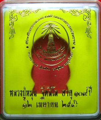 | รายละเอียด | สภาพสวยเดิมๆเนื้อนวโลหะพร้อมกล่องเดิมจากวัดครับครับรุ่นอายุยืน 109 ปี ซึ่งเป็นรุ่นสุดท้ายของหลวงปู่หมุน สำหรับรุ่นนี้ของทุกอย่างได้ผ่านการปลุกเสกโดยหลวงปู่หมุนแน่นอนครับไม่ว่าจะเป็นฉนวนหรือมวลสารต่าง ๆ ก่อนที่จะนำไปประกอบหรือหล่อขึ้นรูปมา เพียงแค่ว่ารุ่นนี้ยังไม่ถึงพิธีสมโภชน์ฉลองพระมหาเจดีย์ในวันที่ 12 มิถุนายน 2546 หลวงปู่หมุนได้ละสังขารไปก่อน 1 เดือนในวันที่ 11 มีนาคม 2546 แต่ก็ยังมีพระเกจิระดับแนวหน้าของทางภาคอีสานมาทำการปลุกเสกพระเครื่องชุดนี้ให้ด้วยได้แก่ หลวงปู่เกลี้ยงแห่งวัดโนนแกลด ศรีสะเกษ มาเป็นองค์ประธาน และหลวงปู่เกลี้ยงก็ยังได้กล่าวให้ทางผู้จัดสร้างทราบว่า "ท่านหมุนก็มาร่วมปลุกเสกด้วยนะ" เมื่อทางผู้จัดสร้างได้ยินหลวงปู่เกลี้ยงบอกเช่นนี้ก็รู้สึกสบายใจว่าหลวงปู่ท่านยังเมตตามาปลุกเสกให้ถึงท่านจะละสังขารไปแล้วก็ตาม จำนวนการสร้างนวโลหะ1446องค์สร้างเนื้อเดียวครับ |