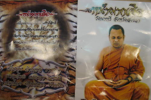 | รายละเอียด | หน้าผากเสือ อาจารย์ภัตร อริโย เจ้าอาวาสวัดนาทวี นำมาทำพิธีปลุกเสกตามแบบโบราณ หนังเสือตัวนี้มีลักษะดีถูกต้องตามตำราโบราณทุกประการ ได้รับจากประเทศอินเดีย ตะกรุดหนังหน้าผากเสือ อาจารย์ภัตร ได้จัดทำพิธีอนุญาตต่อเทวดาที่รักษาหนังเสือที่ละสังขารโดยธรรมชาติ ทำและสร้างตามขั้นตอนตำราบูรพาจารย์ทุกประการ บวงสรวงบูชาเทวดา พระเกจิอาจารย์เจริญพระพุทธมนต์บรรจุพระคาถาเข้าสู่วัตถุมงคลหนังหน้าผากเสือ เสือมีความเชื่อว่าเป็นจ้าวแห่งป่าเรืองอำนาจ บารมี มีเรื่องเล่าเกี่ยวกับเสือมากมาย เช่นคนกลายเป็น เสือกลายเป็นคน หรือเสือสมิง ผููู้้้ภาวนาคาถาหัวใจพยัคฆ์ตั้งมั่นในฌานสามารถทำให้คนอื่นเห็นหรือกลายร่างได้ คณาจารย์โบราณนิยมนำส่วนต่างๆของเสือโดยเฉพาะหน้าผากเสือ(แรงสุด) มาเป็นเรื่องรางของขลัง และส่วนใดๆของเสือที่ละสังขารถือเป็นของคงทนสิทธิ์ ไม่มีสิ่งใดลบล้างอำนาจได้ ยิ่งได้เกจิอาจารย์ที่มีอาคม สมาธิแก่กล้าลงอักขระคาถาบนหนังเสือ ปลุกเสกตามตำรา จะมีอานุภาพครอบจักวาลมีอำนาจต่อผู้พบเห็น สยบสิ่งอัปมงคล ป้องกันคุณไสย ลมเพลมพัด การกระทำของผู้มีอวิชชา หรือทำของ อยู่ยงคงกระพัน แคล้วคลาดปลอดภัย มีโชคลาภ เมตตามหานิยม มหาเสน่ห์ในตัว ดังพญาเสือฉันใดฉันนั้น ใครชอบของอาถรรภ์แรง ไวีอำนาจต่อผู้พบเห็น สยบสิ่งอัปมงคล ป้องกันคุณไสย ลมเพลมพัด การกระทำของผู้มีอวิชชา หรือทำของ แคล้วคลาดปลอดภัย มีโชคลาภ เมตตามหานิยม มหาเสน่ห์ในตัวเอง ป้องกันสัตว์ร้ายต่างๆแม้เดินป่าี ดังพญาเสือฉันใดฉันนั้น คาถายันต์พระยาเสือ พุทธะเสฏโฐมหานาถัง วัณณะโก สิงหะนาทะถัง พุทธะสิระสาเตเชนะ มาระเสนาปะราเชยยัง ชัยยะ ภะวันตุเม (เสก ๑๐๘ คาบ) คาถานี้เป็นคาถาที่ หลวงพ่อปาน วัดมงคลโคธาวาส (วัดบางเหี้ย) ใช้บริกรรมเสก เครื่องรางต่างๆ (มีทั้งอำนาจและเมตตา และผจญศัตรูก็ได้ดีมาก ) คาถาพญาเสือโคร่ง พยัคโฆ พยัคฆะ สัญญาสัพพะติ อิติหิหัมหึม เป็นของหลวงพ่อปาน วัดบางเหี้ย |