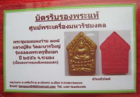 พระขุนแผนผงว่าน หลวงปู่สิน วัดละหารไร่ รุ่นฉลองยศ เนื้อแดงทาทองหลังพลอยเสก พร้อมบัตรรับรอง