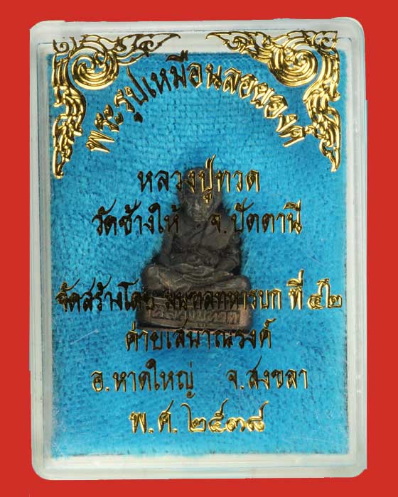 | รายละเอียด | สร้างเมื่อปี 2538 โดยค่ายเสนาณรงค์ หาดใหญ่ -อาจารย์นอง วัดทรายขาว ปลุกเสกให้เป็นปฐมฤกษ์ เมื่อวันที่ 25 มีนาคม 2538 -ปลุกเสกวัดช้างให้ เมื่อวันที่ 1 เมษายน 2538 -ปลุกเสกใหญ่ที่ค่ายเสนาณรงค์ เมื่อวันที่ 8 เมษายน 2538 -เนื้อนวะ พิมพ์เล็ก ตอกโค้ด+หมายเลข+กล่องเดิม สร้างเพียง 4,999 องค์ สวยเดิมๆทุกองค์ |