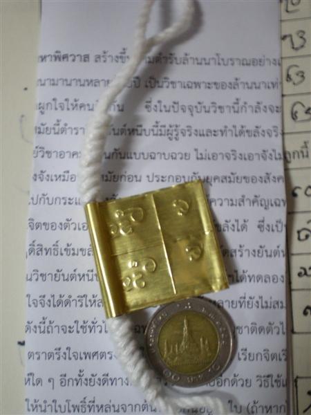 | รายละเอียด | ตะกรุดแผ่นยันต์หนีบมหาพิศวาส สร้างขึ้นตามตำรับล้านนาโบราณอย่างเข้มขลัง ยันต์หนีบเป็นมรดกทาง ไสยเวทย์ที่คู่กับแผ่นล้านนามานานหลายร้อยปี เป็นวิชาเฉพาะของล้านนาเท่านั้น จะมีลักษณะคล้ายกับการทำเสน่ห์ยาแฝด ผูกจิตผูกใจให้คนรักกัน ซึ่งในปัจจุบันวิชานี้กำลังจะสูญหายไปกับกาลเวลาในสังคม ยุคโลกาภิวัฒน์ ในยุคสมัยนี้ตำราวิชายันต์หนีบนี้มีผู้รู้จริงและทำได้ขลังจริงมีน้อย อันด้วยเหตุผลมาจากใน ยุคสมัยนี้ผู้เรียนไสยเวทย์วิชาอาคมเรียนกันแบบฉาบฉวย ไม่เอาจริงเอาจังไม่ประพฤติปฏิบัติตนตามแบบแผน และไม่ฝึกฝนกันอย่างจริงจังเหมือนดังสมัยก่อน ประกอบกับยุคสมัยของสังคมสมัยใหม่ทำให้ผู้ที่ถือเวทย์อาคม ในยุคนี้มีจิตใจ หลงใหลไปกับกระแสของสังคมมากเกินไป ให้ความสำคัญเฉพาะตัวคาถาและวิชาที่เขาเขียนไว้ แต่ไม่ฝึกฝนควบคุมพลังจิตของตัวเองให้มีพลังที่จะปลุกเสกให้ขลังได้ ซึ่งเป็นองค์ประกอบสำคัญในการทำให้เวทอาคมนั้นมีความศักดิ์สิทธิ์เข้มขลัง ยันต์หนีบนี้ได้จัดสร้างยันต์หนีบขึ้นตามตำรับล้านนาโบราณที่สืบทอด กันมา อันเป็นวิชายันต์หนีบโดยเฉพาะ โดยได้ทดลองสร้างขึ้นก่อนแล้วทำการปลุกเสกดูแล้วมีพลังเป็นที่น่า พอ ใจจึงได้ดำริให้สร้างขึ้นเพื่อให้ผู้คนทั้งหลายที่ยังไม่สมหวังในด้านความ รักได้มีของดีไว้บูชา วิธีใช้ยันต์หนีบ มีดังนี้ถ้าจะใช้ทั่วไปไม่เฉพาะเจาะจง ให้บูชาติดตัวไว้เป็นมหาเสน่ห์ เมตตามหานิยม มหาละลวยชั้นสูง ดึงดูด ตราตรึงใจเพศตรงข้ามให้พิศวาสหลงใหล เรียกจิตเรียกใจผู้คนให้เข้ามารักใคร่เสน่หา ไม่แพ้เครื่องราง มหาเสน่ห์ใด ๆ อีกทั้งยังดีทางด้านเจรจาค้าขายอีกด้วย วิธีใช้แบบเฉพาะเจาะจง หากปรารถนาผู้ใดมาเป็นคนรักคู่ครอง ให้นำใบโพธิ์ที่หล่นจากต้นที่ทับกันอยู่ 2 ใบ (ถ้าหากไปหยิบมาจากในวัดต้องชำระหนี้สงฆ์ก่อนคือต้องบูชาเอา หากหาไม่ได้จริงๆใช้กระดาษแทนได้) นำใบโพธิ์ทั้งสองมาตัดให้พอดีโดยใบคว่ำ (ใบที่ทับอยู่ข้างบน) เขียนชื่อ-สกุล เรา ใบหงาย(ใบที่อยู่ด้านล่าง) เขียนชื่อ-สกุลคนที่ปรารถนา แล้วนำใบโพธิ์ทั้งสองประกบด้านที่เขียนชื่อเข้าหากัน นำมาเสียบไว้ในตะกรุดแผ่นยันต์ ขณะที่จะเสียบให้น้อมจิตคิดไปว่าขอให้เรากับเขานั้นเป็นคู่รักกัน แล้วนำไปบูชาท่องด้วยคาถาที่ให้ไว้ก่อนนอนทุกวัน และให้พกตะกรุดติดตัวด้วย ผู้นั้นจะรักเรา หลงเรากังวลจิตกังวลใจจนทนอยู่มิได้ อย่างจับจิตจับใจ คิดถึงคะนึงหาเรา หรือคนที่มีคู่ครองอยู่แล้ว แต่อยากให้เขารักเรามากยิ่งขึ้นให้เขียนชื่อแฟนเราใส