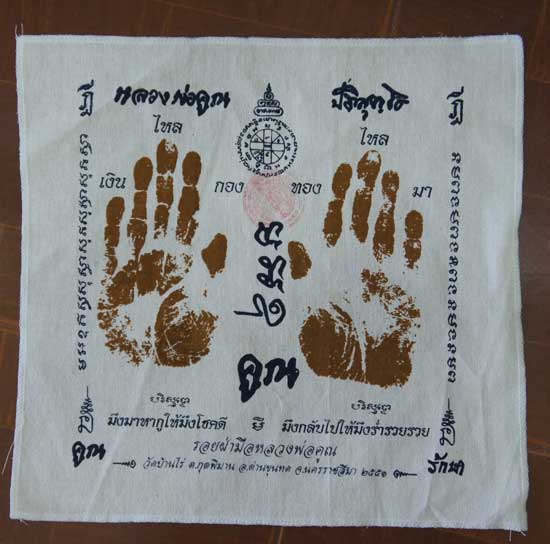 ผ้ายันต์ รอยมือ หลวงพ่อคูณ ปริสุทโธ วัดบ้านไร่ นครราชสีมา ปั๊มตราวัด ปี 2551 เเบบสกรีน