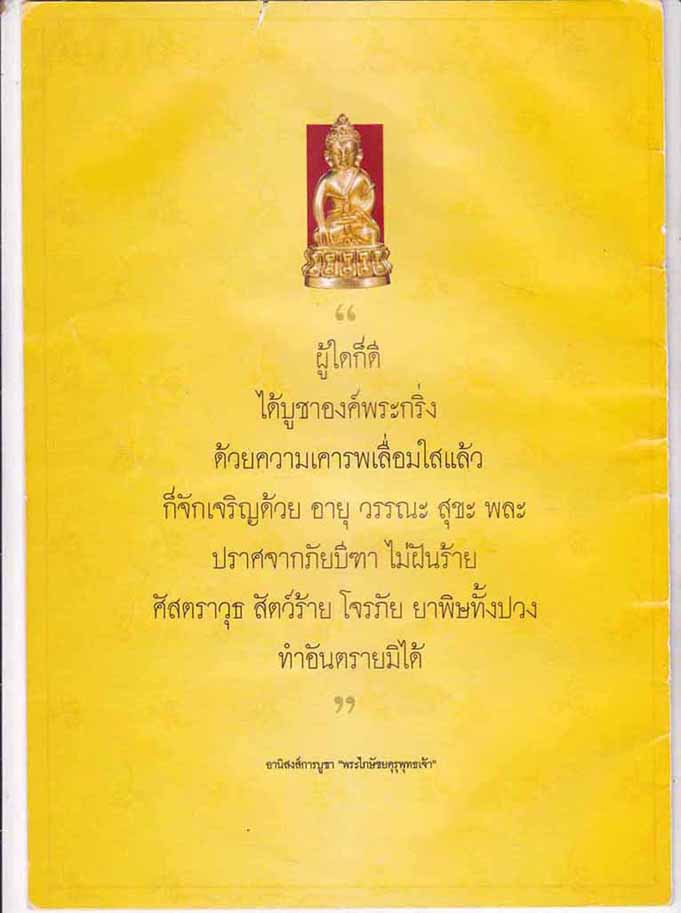 | รายละเอียด | “พระกริ่งหลวง” จัดสร้างโดยสภาสังคมสงเคราะห์แห่งประเทศไทย ในพระบรมราชูปถัมภ์ โดยพิธีมหาพุทธาภิเษก ณ พระอุโบสถวัดพระศรีรัตนศาสดาราม (วัดพระแก้ว) ในพระบรมมหาราชวัง เมื่อวันพุธที่ ๑๙ กรกฎาคม ๒๕๔๙ เนื่องในมหามงคลสมัย ทรงครองสิริราชสมบัติครบ ๖๐ ปี จึงได้สถาปนาพระกริ่งหลวง โดยจารึกชื่อเมือง ๗๖ จังหวัดไว้ใต้ฐาน เพื่อมอบให้แก่ทหาร ตำรวจ อาสาสมัคร ใน ๓ จังหวัดชายแดนภาคใต้และผู้มีจิตเป็นกุศลที่บริจาคบำรุงสภาสังคมสงเคราะห์แห่งประเทศไทยฯ ทั้งนี้ เพื่อเป็นการระดมทุนทรัพย์กว่า ๑๐๐ ล้านบาท ไว้บำรุงสภาสงเคราะห์แห่งประเทศไทยฯ การสร้างพระกริ่งหลวงในครั้งนี้ได้ประกอบพิธีกรรมอันยิ่งใหญ่ตามจารีตประเพณีแต่โบราณกาล คือ ๑.พิธีบวงสรวง ณ วัดป่าแก้ว จ.พระนครศรีอยุธยา และที่วัดจักรวรรดิ ราชาวาส (วัดสามปลื้ม) ๒.พิธีเททองหล่อองค์พระกริ่งหลวงที่พุทธมณฑล จ.นครปฐม ๓.พิธีกวนสีผึ้งเสก ที่วัดพระธาตุลำปางหลวง จ.ลำปาง ๔.พิธีเจิมสีผึ้งองค์พระกริ่งหลวง ณ วัดสุทัศนเทพวราราม โดยพระ เถระจาก ๗๖ จังหวัด โดยมีพระวิสุทธาธิบดี เจ้าอาวาสวัดสุทัศน์ฯ เป็นองค์ประธาน ๕.พิธีมหาพุทธาภิเษกพระกริ่งหลวงของ ๗๖ จังหวัด โดยได้รับพระ บรมราชานุญาตจาก พระบาทสมเด็จพระเจ้าอยู่หัว ให้ประกอบพิธี ณ วัดพระศรีรัตนศาสดาราม ในวันพุธที่ ๑๙ กรกฎาคม ๒๕๔๙ โดยมีพระมหาเถระดังของแผ่นดินร่วมพิธีปลุกเสกครั้งประวัติ ศาสตร์ ๖.พิธีสมโภชฉลององค์พระกริ่งหลวงพร้อมกันทุกวัดสำคัญใน ๗๖ จังหวัดทั่วประเทศ ตั้งแต่วันที่ ๒๑-๒๓ กรกฎาคม ๒๕๔๙ ซึ่งเป็น การจัดพิธียิ่งใหญ่สำคัญครั้งแรกทั่วประเทศ |