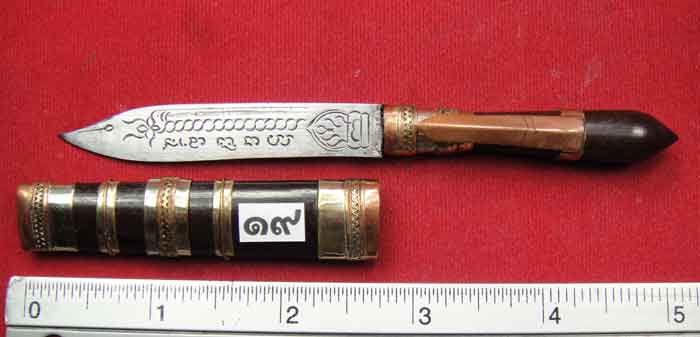 | ชื่อพระเครื่อง | (((วัดใจเคาะเดียว 10 บาท))) มีดหมอลายเสมาใบโพธิ์ด้ามและฝักไม้คูณ ปลอกแหมสามกษัตริย์ ความยาวใบมีดและด |
