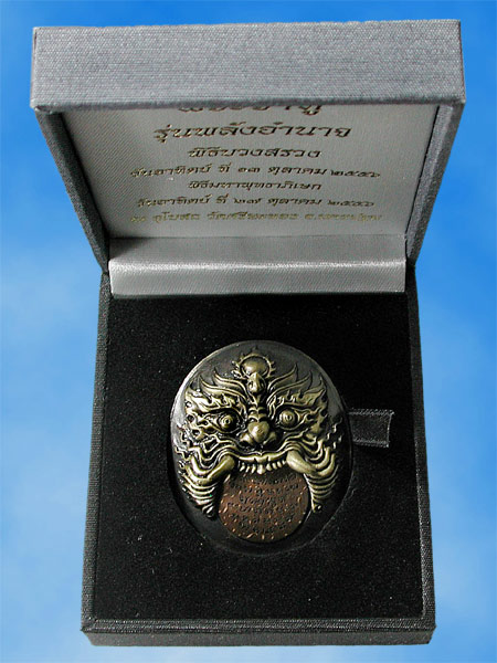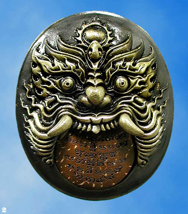 | รายละเอียด | สร้าง 888 เหรียญ เหรียญพระราหูรูปใข่หล่อโบราณ หลังพระคาถาพระราหูสุริยประภา จันทรประภา กลางวัน กลางคืน สูง 4.6 x 3.9 ซม. ด้านหลัง เป็นเนื้อกะลาตาเดียวพระคาถายิงด้วยเลเซอร์ มีหมายเลขและโค๊ดกำกับ พิธีพุทธาภิเษกใหญ่ ณ พระอุโบสถ วัดศรีษะทอง |