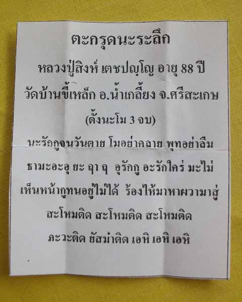 | รายละเอียด | ตะกรุดนะระลึก ถักเชื่อกแดง **สร้าง 299 ดอก** หลวงปู่สิงห์ เตชปญฺโญ อายุ 88 ปี วัดบ้านขี้เหล็ก ต.ตำแย อ.น้ำเกลี้ยง จ.ศรีสะเกษ(หนึ่งในพระอาจารย์ของ อ.อุ้ย เก้ายอด สำนักสักยันต์เก้ายอด จ.อุบลฯ) เป็นตะกรุดมหานิยม มหาระลึก สร้างตามตำราอีสานโบราณ โดยลงพระคาถามหานิยมและนะระลึก พุทธคุณเด่นด้าน เมตตา มหานิยม มหาเสน่ห์ เป็นที่พอใจแก่ผู้พบเห็น มีแต่มิตรไม่มีศัตรู ตะกรุดนะระลึกนี้ตามตำราได้ระบุว่า ผู้ใดได้อาราธนาติดตัว จะเป็นที่เมตตาเอ็นดูแก่ผู้พบเห็น ผู้คนให้ความรัก ความเมตตา ศัตรูจะกลับมาเป็นมิตร เป็นตำราเดิมของ หลวงปู่มุม อินฺทปญฺโญ เทพเจ้าแห่งวัดปราสาทเยอร์เหนือ ที่ได้สั่งสอนไว้ (ส่วนมากหลวงปู่มุมจะลงพระคาถานี้ไว้รอบรูปถ่ายท่านเสมอ) คาถาที่ลงในตะกรุดท่านจะไม่ให้นำมาท่องโดยเด็ดขาด เพราะหลวงปู่มุมบอกว่า พระคาถาวิเศษนี้ ***ถ้าผู้ชายท่องแล้วนั่งกระดานแผ่นเดียวกันกับผู้หญิงที่หมายปองหรือนั่งเสื่อผืนเดียวกัน ก็จะสมหวังแล ท่านเลยห้ามไว้มิให้นำคาถาที่ลงในตะกรุดมาใช้ท่องโดยเด็ดขาด ตำรานี้สร้างยาก เสกยาก ตอนนี้หลวงปู่ก็อายุมากแล้ว ร่างกายก็ไม่เเข็งแรง คงสร้างได้แค่ครั้งเดียวนี่แหละ สร้างเป็นตำนานไว้ว่า ตำราวิชามหานิยมของอีสานก็ไม่เป็นสองรองตำราใด ขอเพียงหมั่นสวด หมั่นบูชาด้วยคาถาที่ให้ไป รับรองเห็นผลแน่นอน (ห้ามใช้ในทางผิดศีลธรรมเด็ดขาด หลวงปู่ท่านได้แช่งไว้แล้ว ชีวิตจะตกต่ำ หาความสุขมิได้ แต่ถ้าผู้ใดใช้ด้วยความรับผิดชอบ ผู้นั้นจะเจริญรุ่งเรืองในทุกๆด้าน) พระคาถาบูชาตะกรุดนะระลึก ตั้งนะโม ๓ จบ นะรักกูจนวันตาย โมอย่าคลาย พุทอย่าลืม ธามะอะอุ ยะ ฤๅ ฤ อุรักกู อะรักใคร่ มะไม่เห็นหน้ากูทนอยู่ไม่ได้ ร้องไห้มาหา ผวามาสู่ สะโหมติด สะโหมติด สะโหมติด ภะวะติด ยัสสะม๋าติด เอหิ เอหิ เอหิ (นี่เป็นเพียงคาถาที่ใช้สวดควบคู่ไปกับการใช้ตะกรุด แต่พระคาถาที่ลงในตะกรุดเป็นอีกบท ไม่สามารถเปิดเผยได้) **หลวงปู่สิงห์ท่านเป็นลูกศิษย์ของหลวงปู่มุม อินฺทปัญโญ วัดปราาทเยอร์เหนือ จ.ศรีสะเกษ และธรรมปอย (หมอธรรม) อ.กันทรารมย์ จ.ศรีสะเกษ |