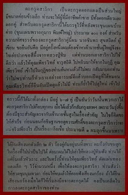 | รายละเอียด | ตะกรุดสาริกาหลวงปู่ทิม ดอกที่1 ว่าด้วยเรื่องหน้าที่การงานและทำมาค้าขายเจริญรุ่งเรืองยิ่งขึ้นไป คิดสิ่งใดได้ดังปรารถนา ดอกที่2 ว่าด้วยเรื่องเมตตามหานิยมมหาเสน่ห์ ไปไหนผู้คนรักใคร่ตลอดเวลาไม่อย่างนั้นหลวงปู่ทิมไม่เอามาใส่ในขุนแผนพรายกุมารหรอกครับ ตะกรุดดอกนี้แท้ดูง่ายมากครับดูเชือกร้อยตะกรุดไม่มีแล้วครับสมัยนี้ตัวตะกรุดเห็นรอยจารนูนแผ่วๆออกมาใครเคยเห็นตะกรุดที่ฝังอยู่หลังขุนแผนแล้วจะเข้าใจครับ แผ่นทองแดงได้มาตราฐานม้วนเล็กมากสำหรับใส่หลังขุนแผน สวยเดิมไม่ผ่านการใช้..... ตะกรุดสาริกาคู่ หลวงปู่ทิม วัดละหารไร่ เชือกเดิมๆ ตัวจริงเสียงจริง ของแท้หายาก ต้องเน้นที่ดูง่ายแบบนี้ครับ ความเก่าเอกลักษณ์จุดสังเกตุหลายประการของตะกรุด เชือกเดิมที่ร้อยมาการมัดขอดเชือกล้วนเป็นจุดพิจารณาทั้งสิ้น ประวัติเกี่ยวกับตะกรุดสาริกาหลวงปู่ทิม เมื่อสมัยก่อนมีอยู่ครั้งหนึ่งที่เจ้าคณะอำเภอบ้านค่าย จ.ระยอง ได้นิมนต์พระคณาจารย์ที่มีชื่อในจังหวัดระยองมา 4 รูป เพื่อให้ทำตะกรุดสาริกาตามแต่ถนัดของแต่ละท่าน เมื่อลงเรียบร้อยแล้วจึงนำตะกรุดสาริกานั้นใส่ลงในบาตรที่มีน้ำอยู่ค่อนบาตรและให้แต่ละองค์ที่นิมนต์มานั่งบริกรรมเรียกตะกรุดให้ลอยขึ้นมาจากบาตร 2รูปแรกเรียกยังไงก็ไม่ลอย จนถึงหลวงพ่อหอม แห่งวัดชากหมาก ซึ่งเป็นรูปที่ 3 ท่านได้นั่งบริกรรมอยู่พักใหญ่ ก็ไม่ปรากฎว่า ตะกรุดจะลอยน้ำขึ้นมาจากบาตรแม้แต่ดอกเดียว ท่านเจ้าอาวาสเห็นเช่นนั้นจึงได้นิมนต์หลวงปู่ทิมนั่งบริกรรมเรียกเป็นรูปสุดท้าย สักพักหนึ่งน้ำในบาตรก็เริ่มหมุนวนไปรอบๆและปรากฏว่า ตะกรุดได้ลอยขึ้นมาจากก้นบาตรหนึ่งดอก หลวงพ่อหอมเห็นเช่นนั้นก็ยังไม่แน่ใจ จึงขอให้หลวงปู่ทิมทำให้ตะกรุดนั้นวิ่งรอบบาตรให้ได้ ท่านจึงจะเคารพนับถือ หลวงปู่ทิมท่านจึงได้เพ่งไปที่ตะกรุดดอกนั้น และเหตุการณ์ที่ไม่คาดฝันก็เกิดขึ้น ตะกรุดดอกนั้นก็วิ่งไปรอบบาตรทันที ทำความตกตะลึงแก่ผู้ที่ได้เห็นเหตุการณ์วันนั้นเป็นอย่างมาก นับแต่บัดนั้นชื่อเสียงของหลวงปู่ทิมจึงเป็นที่กล่าวขวัญตั่งแต่นั้นมา การสร้างตะกรุดสาริกานั้น หลวงปู่ทิม ท่านจะต้องดูฤกษ์ดูยามให้ดีกว่าจะลงตะกรุดนี้ได้ ในอาทิตย์หนึ่งมีเพียงวันเดียวเท่านั้นที่สามารถทำได้ คือ วันจันทร์ ท่านจะเตรียมตัดแผ่นทองแดงให้เป็แผ่นเล็กๆก่อน และเริ่มทำการลงในเช้าตรูของวันจันทร์ทันที ก่อนลงอักขระต้องตั้งจิตให้มั่น โดยตั้งสมาธิอ่านโองการให้ดี หูต้องคอยฟังเสียงนกสาริการ้อง พอได้ยินนกร้อ