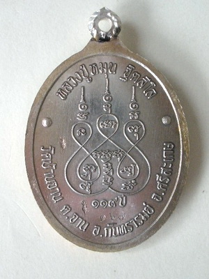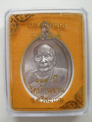 | รายละเอียด | เหรียญห่วงเชื่อม เนื้อขัดซาติน ห่วงเงินหลวงปู่หมุน วัดบ้านจาน แยกจากชุดกรรมการร่วมสร้าง รุ่น 119 ปี (ร.ศ.232) หมายเลข ๑๖๗ จากจำนวนสร้าง 998 เหรียญ |
