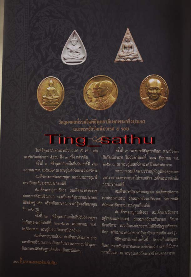| รายละเอียด | คัดสวย !! 13.พระสมเด็จจิตรลดา 2 วัดบวรฯ เนื้อผงจิตรลดา+เส้นพระเจ้า (เส้นพระเกศาในหลวง) หลัง ภปร. ผงเดียวกับอุดกริ่งปวเรศ 30 วัดบวรฯ พระสมเด็จจิตรลดา (พระพุทธนวราชบพิตรฯ) ภปร. พ.ศ. 2529-2530 วัดบวรฯ 1. พระเครื่องชุดนี้ ได้รับพระราชทานพระนามว่า “พระพุทธนวราชบพิตร” ซึ่งเป็นพระนามเดียวกันกับ "สมเด็จจิตรลดา" 2. เป็นพระที่มีพระพุทธลักษณะ เดียวกันกับ "สมเด็จจิตรลดา" 3. มวลสารผงจิตรลดา พระราชทานพร้อมกัน กับพระกริ่งปวเรศ ปี 30 และเป็นมวลสาร ชุดเดียวกันกับที่ใส่ในรูกริ่ง พระกริ่งปวเรศปี 30 4. เข้าพิธี พุทธาภิเศก พร้อมกันกับ "พระกริ่งปวเรศปี 30" 5. ด้านหลังประทับตรา "ภปร." พระจิตรลดา "พระพุทธนวราชบพิตร" พระบาทสมเด็จพระเจ้าอยู่หัวทรงพระกรุณาโปรดเกล้า พระราชทานผงจิตรลดา ผสมเส้นพระเจ้าในการจัดสร้างพระผง "พระพุทธนราชบพิตร" และมีพระบรมราชานุญาติให้ จารึกพระปรมาภิไทย ภปร. ด้านหลังองค์พระ สมเด็จพระเทพรัตนราชสุดา ฯ ทรงเสด็จพระราชดำเนิน ในการประกอบพิธี ณ.วัดบวรฯ ในวันเสาร์ ที่ 12 เมษายน 2529 สมเด็จพระสังฆราช ทรงเป็นประธาน พิธีอธิฐานจิต โดยมีพระอาจารย์ ผู้ทรงศีลาจริยวัตร ร่วมพิธี ดังนี้ พระญาณโพธิ์ (เข็ม) วัดสุทัศน์ ลป. เมฆ วัดลำกระดาน ลพ. สิม วัดถ้ำผาปล่อง ลพ. สำเนียง วัดเวฬุวนาราม ลพ. พุธ ฐานิโย ลพ. มงคลธรรมสุนทร วัดบางนา ลพ. เกตุ วัดเกาะหลัก ลพ. พรหม วัดขนอนเหนือ ลพ. หยอด วัดแก้วเจริญ ลพ. พูล วัดไผ่ล้อม ลพ. แช่ม วัดดอนยายหอม ลพ. ไพฑูรย์ วัดโพธินิมิต ฯลฯ เป็นต้น (พิธีเดียวกัน พร้อมกันกับ พระกริ่งปวเรศปี30 ) รับประกันพระแท้ สนใจข้อมูลเพิ่มเติมติดต่อ 08-1622-1037 083-2699000 Email : Ting_ptk@yahoo.com ภาณุภัณฑ์ พระเครื่อง เชิญที่นี่ >>> http://www.web-pra.com/Shop/TingSathu |