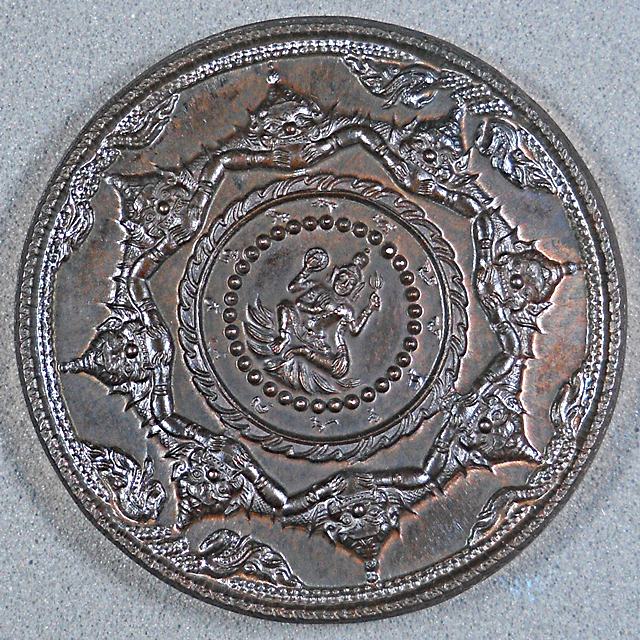 | รายละเอียด | ประกอบพิธีกรรม 3 วาระ ได้แก่ -วาระที่ 1 พฤหัสบดี ที่ 4 ม.ค 50 พิธีเททองหล่อนำฤกษ์ บริเวณหน้าศาลหลักเมือง จ.นครศรีธรรมราช พิธีเทวาภิเษก นั่งปรกอธิษฐานจิตและสวดเจริญพระพุทธมนต์ โดยมีพระราชธรรมสุธี วัดพระมหาธาตุมหาวรวิหาร อาจารย์เอื้อม วัดบางเนียน และพระครูวิชัยนันทคุณ เจ้าอาวาสวัดศาลามีชัย จ.นครศรีธรรมราช เป็นประธานฝายสงฆ์ โดยมีนายบุญญวัฒน์ ชีช้าง ปลัดจังหวัดนครศรีธรรมราช เป็นประธานฝ่ายฆราวาส คณาจารย์สายเขาอ้อร่วมพิธีปลุกเสก อาทิอาจารย์คล้อย วัดภูเขาทอง อาจารย์เอียดวัดโคกแย้ม สายสุราษฎร์ธานีมีอาจารย์ท้วมวัดศรีสุวรรณ สายนครศรีธรรมราชมี อาจารย์เนียม วัดบางไทร อาจารย์ไพสิษฐ์ อาศรมวังวิเวกสามแก้ว - วาระที่ 2 เสาร์ที่ 7เม.ย 50 พิธีเทวาภิเษก สวดเจริญพระพุทธมนต์ นั่งปรกอธิษฐานจิต ณ ศาลหลักเมือง จ.นครศรีธรรมราช - วาระที่ 3 อาทิตย์ที่ 8 เม.ย 50 พิธีสมโภชมหาจักรพรรดิ พิธีพุทธาภิเษก ณ วัดพระมหาธาตุมหาวรวิหาร จ.นครศรีธรรมราช 1.สมทบทุนการซ่อมแซมอุโบสถ วัดศาลามีชัย อ.เมือง จ.นครศรีธรรมราช 2.สมทบทุนการสร้างอุโบสถ วัดคีรีรัฐพัฒนาราม หรือวัดเผียน อ.ร่อนพิบูลย์ จ.นครศรีธรรมราช 3.สมทบทุนการส่งเสริมกิจกรรมสงฆ์ วัดควนสวรรค์ อ.ฉวาง จ.นครศรีธรรมราช -พญานาค 4 ตัว ล้อมกรอบชั้นนอกสุด โดยพญานาคหรืองูใหญ่เป็นสัญลักษณ์แห่งความยิ่งใหญ่ ความอุดมสมบูรณ์ ความมีวาสนา เป็นผู้มีอิทธิฤทธิ์ ศรัทธาในพุทธศาสนา ตามหลักไตรภูมิ -สะพานนาคราช ยังหมายถึง สะพานที่เชื่อมระหว่างโลกมนุษย์กับสวรรค์นั่นเอง ซึ่งคล้องจองกับความเชื่อของชาวฮินดู ถือว่านาคเป็นสะพานเชื่อมภาวะปกติกับที่สถิตของเทพ เช่น ปราสาทหินนครวัด จึงทำเป็นพญานาคราช ที่ทอดยาวรับมนุษย์ตัวเล็ก ๆ สู่โลกแห่งความศักดิ์สิทธิ์ และราวบันได้ทางขึ้นสู่ศาลหลักเมือง จ.นครศรีธรรมราช ก็ถูกออกแบบให้เป็นบันไดพญานาคเช่นกัน -ราหู เป็นผู้กลืนกินสิ่งอัปมงคลทั้งมวล ทั้งยังเป็นผู้มอบสิ่งมงคล และให้ทรัพย์สิน โชคลาภแก่ผู้บูชา -12 นักษัตร เป็นสัญลักษณ์แทนนามปีเกิดของมวลมนุษย์ และเป็นตราสัญลักษณ์ประจำเมืองนครศรีธรรมราช -องค์จตุคามรามเทพ อยู่ตรงาจุดศูนย์กลาง ผู้ทรงบำเพ็ญเพียรบารมี เป็นพระโพธิสัตว์ เพื่อบรรเทาทุกข์แก่มวลมนุษย์ กล่าว คือ ด้านหน้าจะเป็นสัญลักษณ์แห่งดวงตราจตุคามรามเทพ เป็นดวงตราอันศักดิ์สิทธิ์ ซึ่งเป็นไปตามศาสตร์แห่งองค์จตุคามรามเทพ ซึ่งทรงฤทธิ์ธานุภาพ โดยมีพญานาคซึ่งถือเป็นสัญลักษณ์ของสะพานเชื่อมโลกมนุษย์ กับองค์เทพนั่นเอง -ด้านหลังนั้น มีพญานาค 1 ตัว ล้อมรอบกรอบและมีห