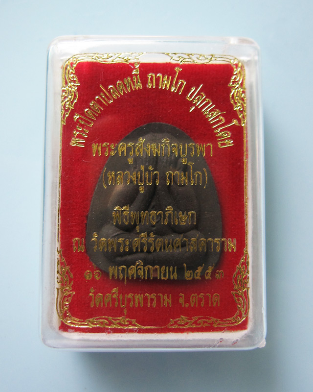 พระปิดตาปลดหนี้ หลวงปู่บัว ถามโก วัดศรีบุรพาราม เนื้อผงใบลาน ตะกรุดทองแดง รุ่นเพชรกลับ ญสส. พ.ศ.2553