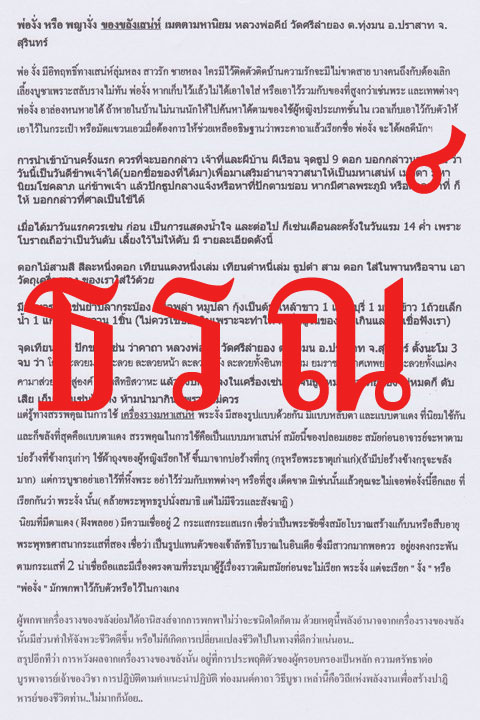| รายละเอียด | พระงั่งตาแดงถูกสร้างมานานเกือบพันปี โดยฤาษีผู้ชาญพระเวทแห่งอาณาจักรขอมโบราณ มีฤทธิ์แรงกล้า ทรงฤทธิ์คุณหลายประการ บูชาในด้านโชคลาภหรือมหาเสน่ห์ก็ได้ทั้งนั้น มีผู้ประสบความขลังของงั่งตาแดงมาแล้วมากมาย พระฤาษีหรือเกจิอาจารย์จึงสร้างและเสกสืบต่อกันมาช้านาน ฐานกว้าง 1.5 ซม. สูงรวมยอด 4 ซม. ขนาดพกติดตัวพอดี พร้อมใบคาถา และวิธีใช้ ยังไม่ผ่านการใช้ จากวัดโดยตรง เนื้อโลหะผสม ใต้ฐานอุดกริ่ง ปี 48 วัตถุมงคลเครื่องรางของคลังสายเขมร เมตตามหาเสน่ห์ เมตตามหานิยม โชคลาภ แคล้วคลาดปลอดภัย ค้าขายร่ำรวย รุ่นเศรษฐีรวยทรัพย์ สร้างเพียง 1999 องค์เท่านั้น หลวงปู่คีย์ กิตติญาโณ วัดศรีลำยอง ต.ทุ่งมน อ.ปราสาท จ.สุรินทร์ อธิฐานจิตปลุกเสก วัตถุมงคลรุ่นเศรษฐีรวยทรัพย์ พิธีมหาพุทธา ประดุจคาถาและประจุธาตุทั้ง 4 คือ ดิน น้ำ ลม ไฟ เข้าสู่วัตถุมงคล เพื่อความสมบูรณ์ตามประเพณี และความศักดิ์สิทธิ์ เข้มขลังถูกต้อง เพื่อประสงค์จะให้ผู้ที่เคารพศรัทธาในองค์หลวงปู่คีย์ ที่จัดสร้างขึ้นในครั้งนี้มีไว้บูชาที่บ้านหรือติดตัว จะอยู่เย็นเป็นสุข คุ้มภัยกันภัย และมีความเจริญรุ่งเรือง ดีนักแล ฯ พร้อมใบคาถา เกจิที่กำลังมาแรงอีกท่านหนึ่่งของเมืองสุรินทร์ ผู้พกพาเครื่องรางของขลังย่อมได้อานิสงส์จากการพกพาไม่ว่าจะชนิดใดก็ตาม ด้วยเหตุนี้พลังอำนาจจากเครื่องรางของขลังนั้นมีส่วนทำให้จังหวะชีวิตดีขึ้น หรือไม่ก็เกิดการเปลี่ยนแปลงชีวิตไปในทางที่ดีกว่าแน่นอน.. สรุปอีกทีว่า การหวังผลจากเครื่องรางของขลังนั้น อยู่ที่การประพฤติตัวของผู้ครอบครองเป็นหลัก ความศรัทธาต่อบูรพาจารย์เจ้าของวิชา การปฎิบัติตามคำแนะนำปฏิบัติ ท่องมนต์คาถา วิธีบูชา เหล่านี้คือวิถีแห่งพลังงานเพื่อสร้างปาฎิหารย์ของชีวิตท่าน..ไม่มากก็น้อย |