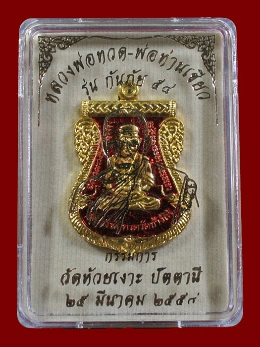 เหรียญหลวงพ่อทวด - พ่อท่านเขียว รุ่นกันภัย 58 เนื้อกะไหล่ทองลงยา สีแดง หมายเลข 1394 พร้อมกล่อง