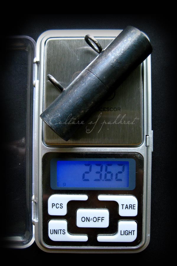 | รายละเอียด | ปลอกตะกรุดเงินมือสอง เส้นผ่าศูนย์กลางภายในสูงสุด 15 มม. ยาว (วัดภายนอก) 5.8 ซม. สำหรับใส่ตะกรุดหนังเสือ หรืออื่นๆ ที่มีขนาดใกล้เคียงกัน |