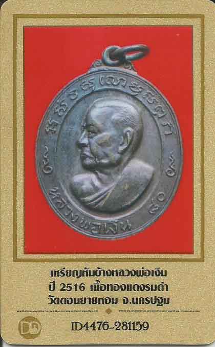 เหรียญหันข้างหลวงพ่อเงิน วัดดอนยายหอม นครปฐม ๒๕๑๖+บัตรรับรองพระแท้*263