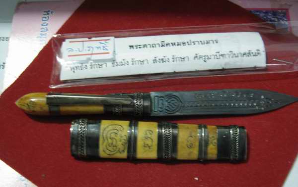 | รายละเอียด | มีดหมอปราบมาร ลพ.ฤทธิ์ วัดชลประทาน จ. สุรินทร์ สวยๆเบาๆ... ทำจากกระดูกช้าง ยาว 4.5 นิ้ว สร้างประมาณ ปี45-46 งานสวยๆ เล่มนี้แบ่งให้บูชาครับ.... |