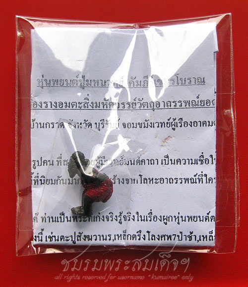 | รายละเอียด | หุ่นพยนต์ปู่มหาเวทย์ หลวงพ่อกอย วัดเขาดินใต้ บุรีรัมย์ สร้างตามตำราเขมรโบราณ วัตถุอาถรรพณ์ที่นำมาสร้างอาทิเช่น ตะปูสังฆวานร เหล็กตรึงโรงศพ ๗ ป่าช้า เหล็กขนันผี เงินปากผี ๑๐๐ วัด ตะปูโรงศพ ๙ วัด เป็นต้น พุทธคุณเน้นด้านเมตตา ขับไล่สิ่งอัปมงคล กันคุณไสย การกระทำย่ำยี เฝ้าเรือกสวนไร่นา กันขโมย ป้องกันภัยให้คลาดแคล้วจากอันตรายทั้งปวง ขนานโดยประมาณ 1.0*1.8 ซม. |