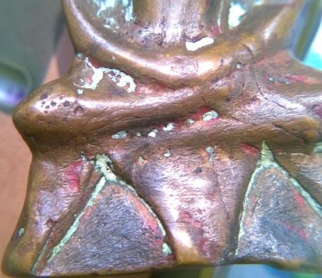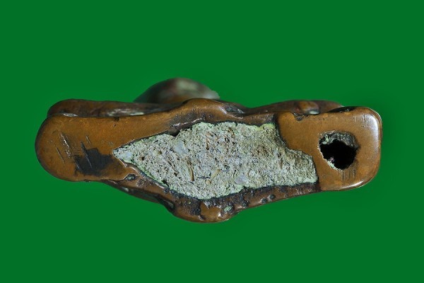 ผิวพระเหมือนใช้แม่พิมพ์ที่เป็นไม้เนื้อแข็งทำเลยครับ ไต้ฐานมีอุดดินดิบผสมว่าน และมีเจาะรูไว้ด้วยครับ