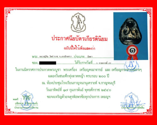 คอยเห็นใบประกาศออกที่ จ.กาญจนบุรี มาใบหนึ่งได้ที่หนึ่งด้วยพระปิตตา แต่ดูพระไม่แท้ครับ ไม่รู้ว่าออกที่เดียวกันหรือเปล่าเห็นมาหลายปีแล้ว