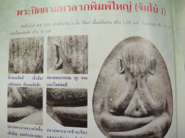 พิมพ์ทรงแบบนี้เรียกว่า พระปิดตามหาลาภพิมพ์ใหญ่ (จัมโบ้ 1 ) จัดสร้างในปี 2520 สร้างด้วยกัน 3 เนื้อ ผงใบลาน 1,272 องค์ ผงเกษร 57 องค์ ผงสมเด็จ 16 องค์ ทั้งสององค์ที่ลงถามมานี้ไม่ได้ถ่ายรูปด้านหลังมาให้ดู คงให้ได้เฉพาะรายละเอียดพิมพ์ทรงเท่านั้น