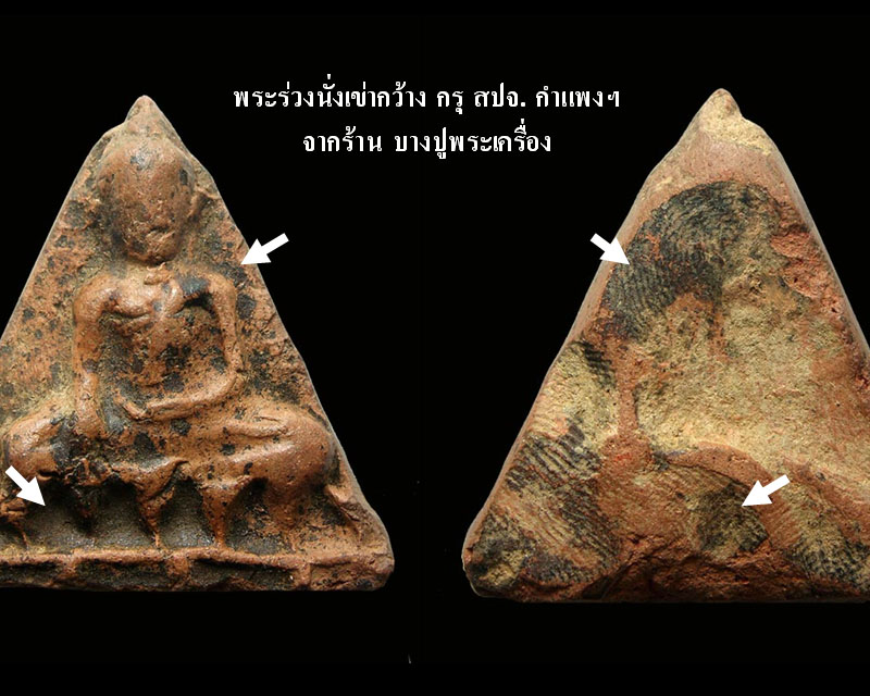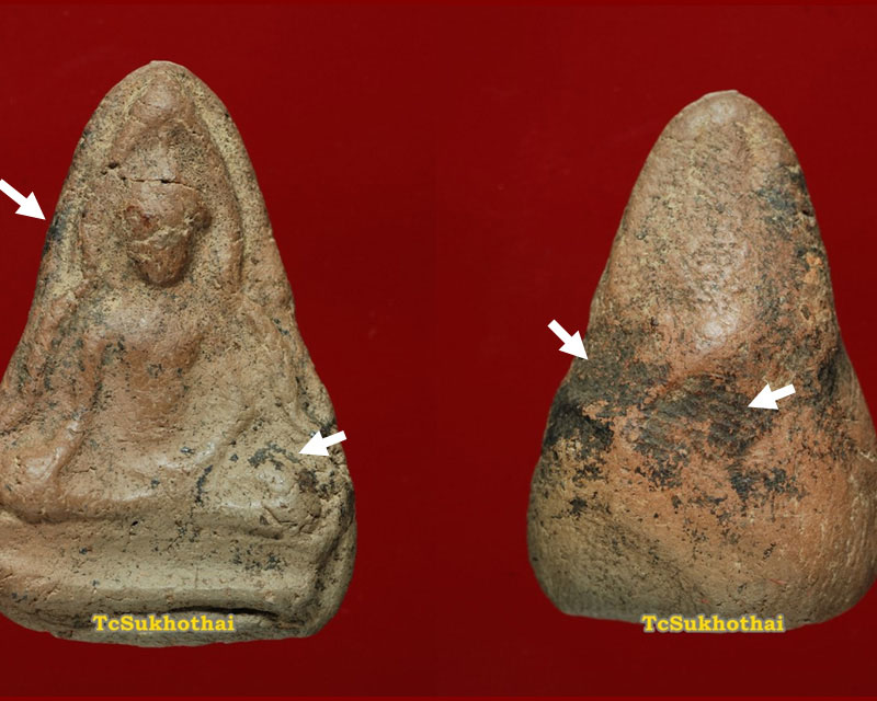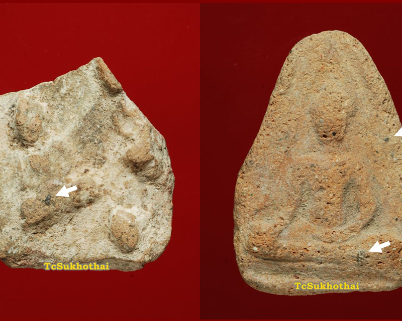 ต้องยอมรับอย่างหนึ่งว่า พระกรุสมัยอยุธยา(ตอนต้น) - สุโขทัยขึ้นไป ส่วนใหญ่การบรรจุกรุจะฝังลงดิน ไม่นิยมบรรจุกรุที่อยู่บนเจดีย์สักเท่าไร(ส่วนใหญ่นะครับ...) และส่วนหนึ่งมักจะมีว่านผสมด้วย เมื่อเวลาลงกรุจึงมักจะให้ปูนขาวใส่ลองพื้นเอาไว้ด้วย จากที่เคยสอบถามคนรุ่นเก่า(นักขุด) ให้ความเห็นว่า อย่างแรกใช้สำหรับป้องกันความชื้นที่มีอยู่ในดิน อย่างที่สอง สำหรับพระเนื้อว่านก็เอาไว้ป้องกันแมลงเข้ามากินเนื้อพระ จากรูปแรกที่เป็นชิ้นส่วนพระเชตุพน คราบขาวๆ นั่นแหละที่บอกครับ ส่วนลูกศรสีขาวๆ นั่นแหละที่ชี้ ว่า ราดิน เป็นแบบนี้ ครับ