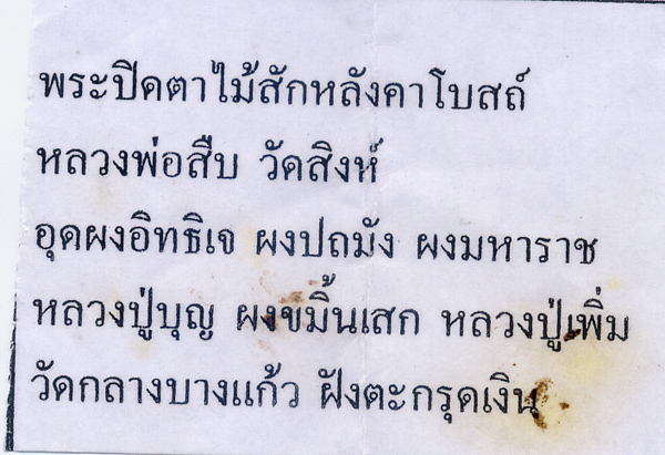 พระปิดตาไม้สักหลังคาโบสถ์ จารมือ หลวงพ่อสืบ วัดสิงห์ ปี 2554