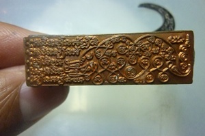 จัดสร้างโดยแผ่นทองแดงขนาด 1 x 1.9 นิ้ว จารอักขระเลขยันต์ด้วยมือล้วนๆ ทั้งหน้าและหลัง ม้วนกลึงคลุก