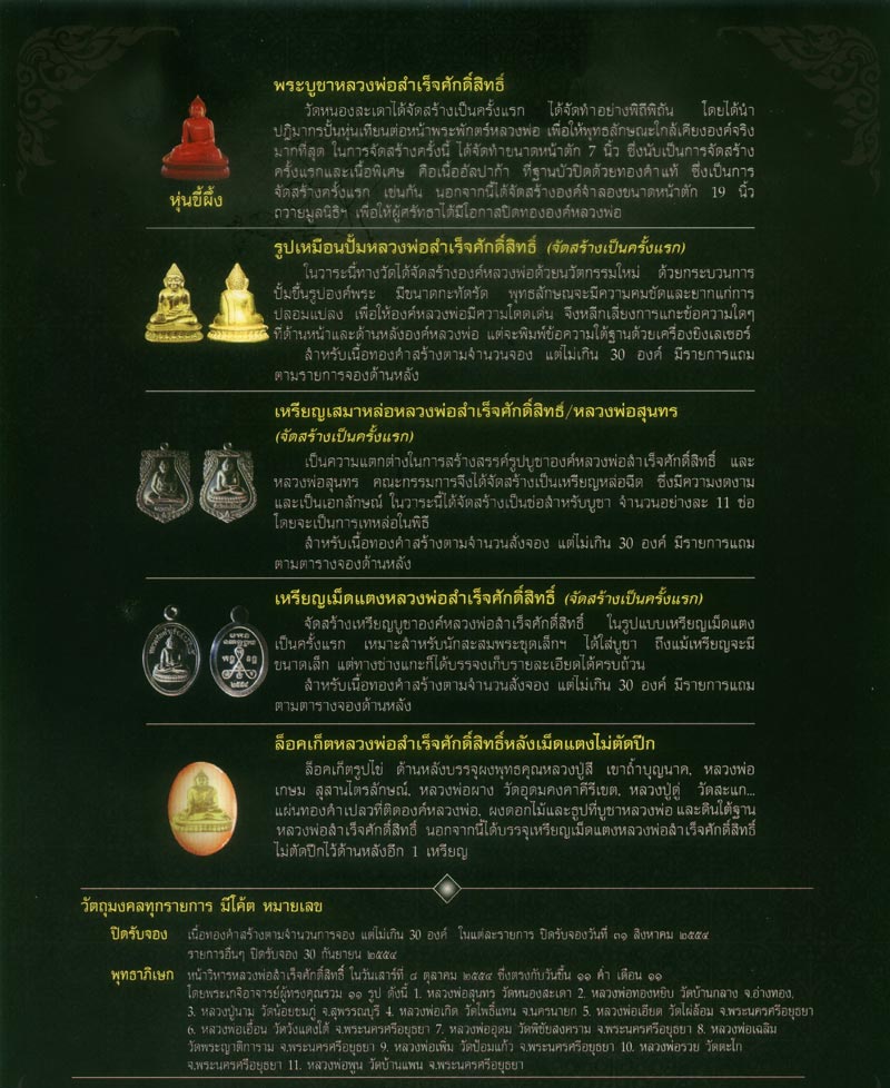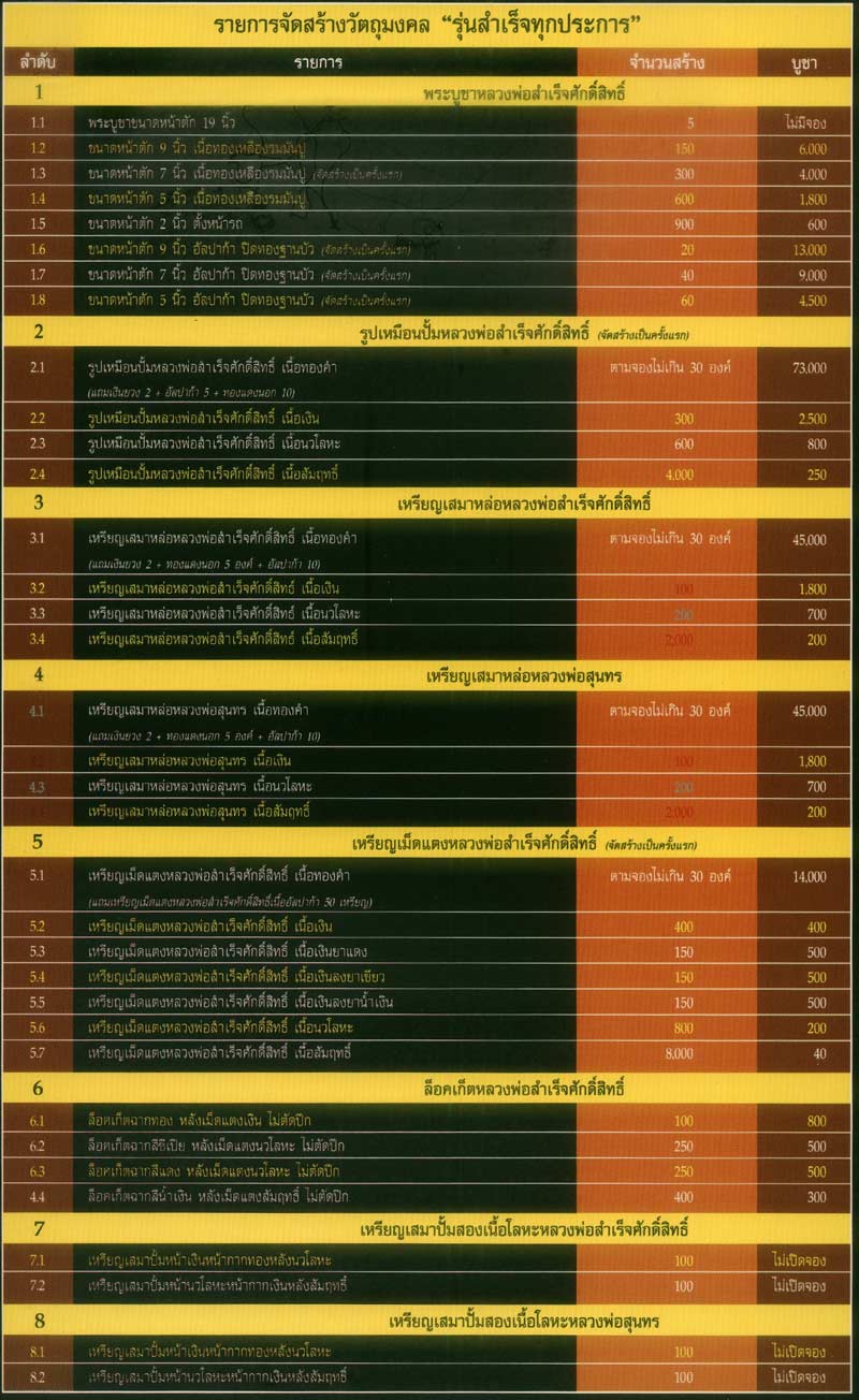 รายการจัดสร้างวัตุมงคล "รุ่นสำเร็จทุกประการ"