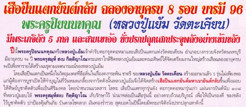 ซึ่งขณะนี้ ทางวัดตะเคียนได้จัดสร้าง เสือปืนแตกรุ่นที่ 7 ชื่อรุ่นว่า เสือปืนแตกยันต์กลับ เพื่อฉลองอายุ 8 รอบ 96 ปี ของหลวงปู่แย้ม
