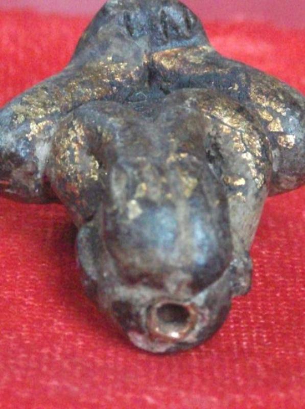 พระปิดตาเนื้อผสมผงครับ มีคราบรักแห้งๆและปิดทองมาแต่เดิมครับ และฝังตระกุดทองแดงข้างบน 1 ดอกข้างล่างอีก 1 ดอก พี่ๆท่านใดทราบ ช่วยบอกผมที่นะครับ