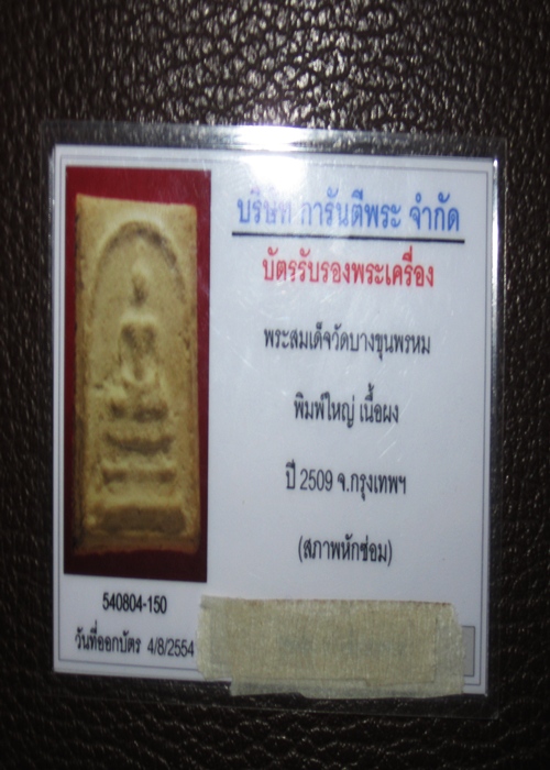 พระองค์นี้ถ้าเราตัดบัตรรับรองออกไปก่อน จากรูปพิมพ์ทรงยังไงก็ไม่ใช่บางขุนพรม 09 เนื้อหาจากรูปเป็นพระสมเด็จบางขุนพรมปี 09 เก๊ทั่วๆไป ประกอบกับการถ่ายรูปที่ไม่ได้มาตรฐาน ถ่ายมุมเอียงย้อนขึ้น พิมพ์พระดูสั้นต้อผิดรูป จากรูปผมดูไม่แท้อีกเสียงครับ ถ้าท่านมั่นใจว่าแท้ ขายในเว็ปเจ้าของบัตรดูครับ ขายแบบที่ขายในเว็ปพระนะครับ รูปถ่ายเดียวกันนี้ อย่าเพิ่งโชว์บัตร เว็ปไหนก็ได้ครับ รับรองโดนตีเก๊ทุกเว็ป